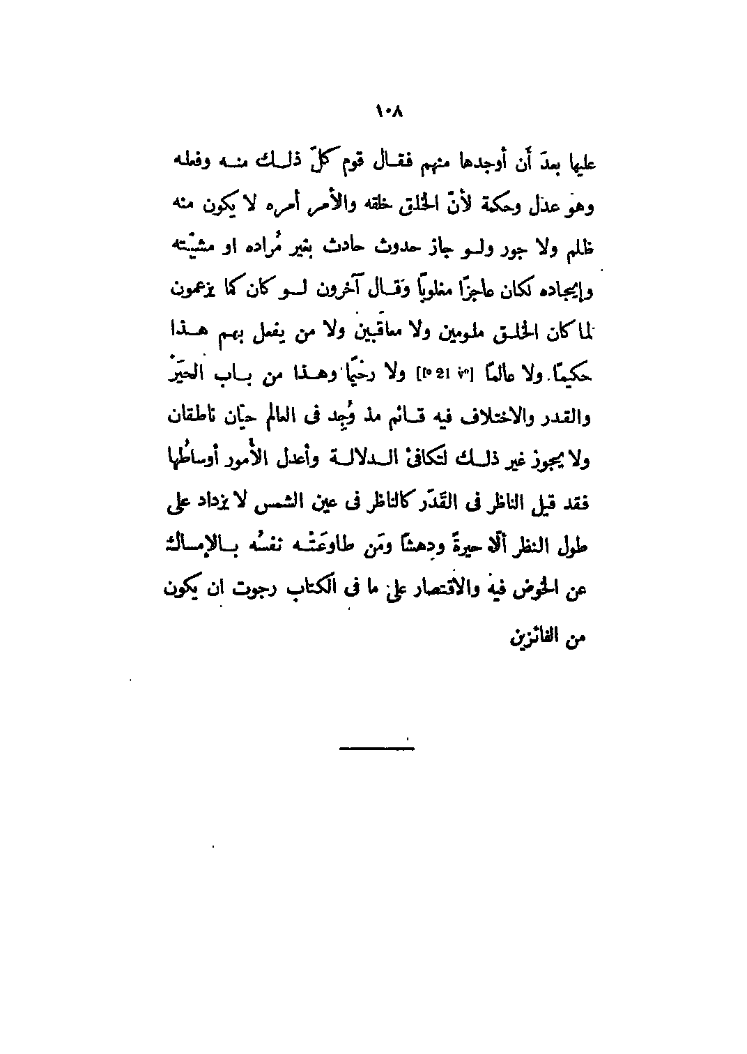 عليها بعد أن أوجدها منهم فقال قوم كل ذلك منه وفعله وهو عدل وحكمة لأن الخلق خلقه والأمر أمره لا يكون منه ظلم ولا جور ولو جاز حدوث حادث بغير مراده أو مشيته وإيجاده لكان عاجزاً مغلوباً وقال آخرون لو كان كما يزعمون لما كان الخلق ملومين ولا معاقبين ولا من يفعل بهم هذا حكيماً ولا عالماً [21] ولا رحيماً وهذا من باب الحير والقدر والاختلاف فيه قائم مذ وجد في العالم حيان ناطقان ولا يجوز غير ذلك لتكافئ الدلالة وأعدل الأمور أوساطها فقد قيل الناظر في القدر كالناظر في عين الشمس لا يزداد على طول النظر ألا حيرة ودهشاً ومن طاوعته نفسه بالإمساك عن الخوض فيه والاقتصار على ما في الكتاب رجوت أن يكون من الفائزين