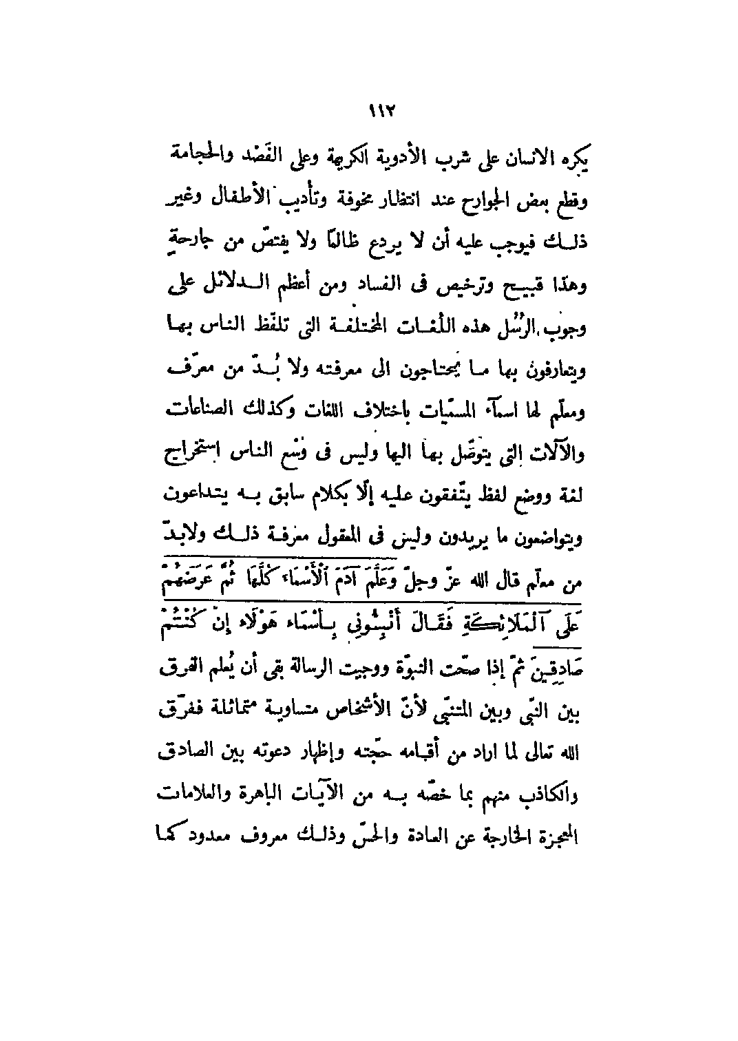 يكره الإنسان على شرب الأدوية الكريهة وعلى الفصد والحجامة وقطع بعض الجوارح عند انتظار مخوفة وتأديب الأطفال وغير ذلك فيوجب عليه أن لا يردع ظالماً ولا يفتص من جارحة وهذا قبيح وترخيص في الفساد ومن أعظم الدلائل على وجوب الرسل هذه اللغات المختلفة التي تلفظ الناس بها ويتعارفون بها ما يحتاجون الى معرفته ولا بدّ من معرف ومعلم لها أسماء المسميات باختلاف اللغات وكذلك الصناعات والآلات التي يتوصل بها إليها وليس في وسع الناس استخراج لغة ووضع لفظ يتفقون عليه إلا بكلام سابق به يتداعون ويتواضعون ما يريدون وليس في المعقول معرفة ذلك ولا بدّ من معلّم قال الله عزّ وجلّ وَعَلَّمَ آدَمَ الْأَسْماءَ كُلَّها ثُمَّ عَرَضَهُمْ عَلَى الْمَلائِكَةِ فَقالَ أَنْبِئُونِي بِأَسْماءِ هؤُلاءِ إِنْ كُنْتُمْ صادِقِينَ 2: 31 ثمّ إذا صحّت النبوّة ووجبت الرسالة بقى أن يُعلم الفرق بين النّبي وبين المتنبّي لأنّ الأشخاص متساوية متماثلة ففرّق الله تعالى لما أراد من أقامه حجّته وإظهار دعوته بين الصادق والكاذب منهم بما خصّه به من الآيات الباهرة والعلامات المعجزة الخارجة عن العادة والحسّ وذلك معروف معدود كما