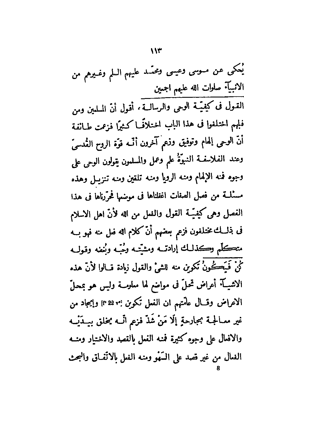 أقول أنّ المسلمين ومن قبلهم اختلفوا في هذا الباب اختلافاً كثيراً فزعمت طائفة أنّ الوحي إلهام وتوفيق وزعم آخرون أنّه قوّة الروح القُدسيّ وعند الفلاسفة النبوّةُ علم وعمل والمسلمون يقولون الوحي على وجوه فمنه الإلهام ومنه الرويا ومنه تلقين ومنه تنزيل وهذه مسألة من فصل الصفات أغفلناها في موضعها فحرّرناها في هذا الفصل وهي كيفيّة القول والفعل من الله لأنّ أهل الإسلام في ذلك مختلفون فزعم بعضهم أنّ كلام الله فعل منه فهو به متكلّم وكذلك إرادته ومشيّته وحبّه وبُغضه وقوله كُنْ فَيَكُونُ 2: 117 تكوين منه للشيء والقول زيادة قالوا لأنّ هذه الأشياء أعراض تحلّ في مواضع لها معلومة وليس هو بمحلّ الأعراض وقال عامّتهم أن الفعل تكوين [22] وإيجاد من غير معالجة بجارحةٍ إلاّ مَنْ شَذّ فزعم أنّه يخلق بيدَيْه والأفعال على وجوه كثيرة فمنه الفعل بالقصد والاختيار ومنه الفعال من غير قصد على السَهْو ومنه الفعل بالاتّفاق والبحث