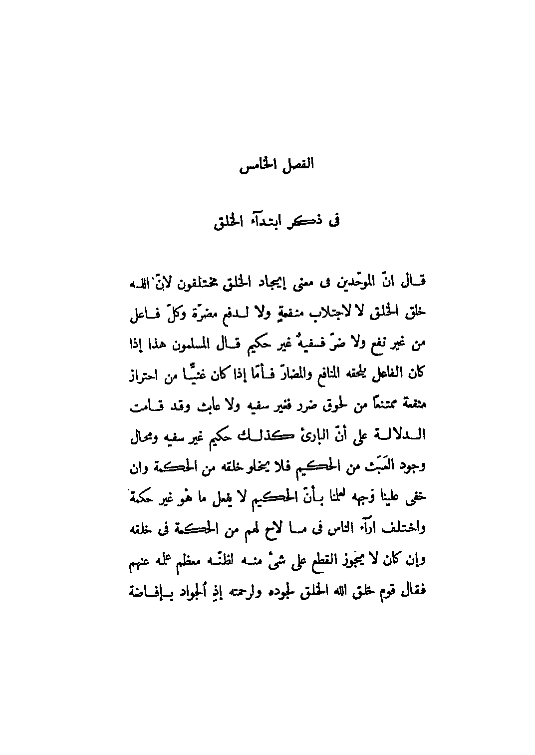 قال أنّ الموحّدين في معنى إيجاد الخلق مختلفون لأنّ الله خلق الخلق لا لاجتلاب منفعةٍ ولا لدفع مضرّة وكلّ فاعل من غير نفع ولا ضرّ فسفيهٌ غير حكيم قال المسلمون هذا إذا كان الفاعل يلحقه المنافع والمضارّ فأمّا إذا كان غنيًّا من احتراز منفعةً ممتنعاً من لحوق ضرر فغير سفيه ولا عابث وقد قامت الدلالة على أنّ البارئ كذلك حكيم غير سفيه ومحال وجود العَبَث من الحكيم فلا يخلو خلقه من الحكمة وإن خفي علينا وجهه لعلمنا بأنّ الحكيم لا يفعل ما هو غير حكمة واختلف آراء الناس في ما لاح لهم من الحكمة في خلقه وإن كان لا يجوز القطع على شيء منه لظنّه معظم علمه عنهم فقال قوم خلق الله الخلق لجوده ولرحمته إذ الجواد بإفاضة