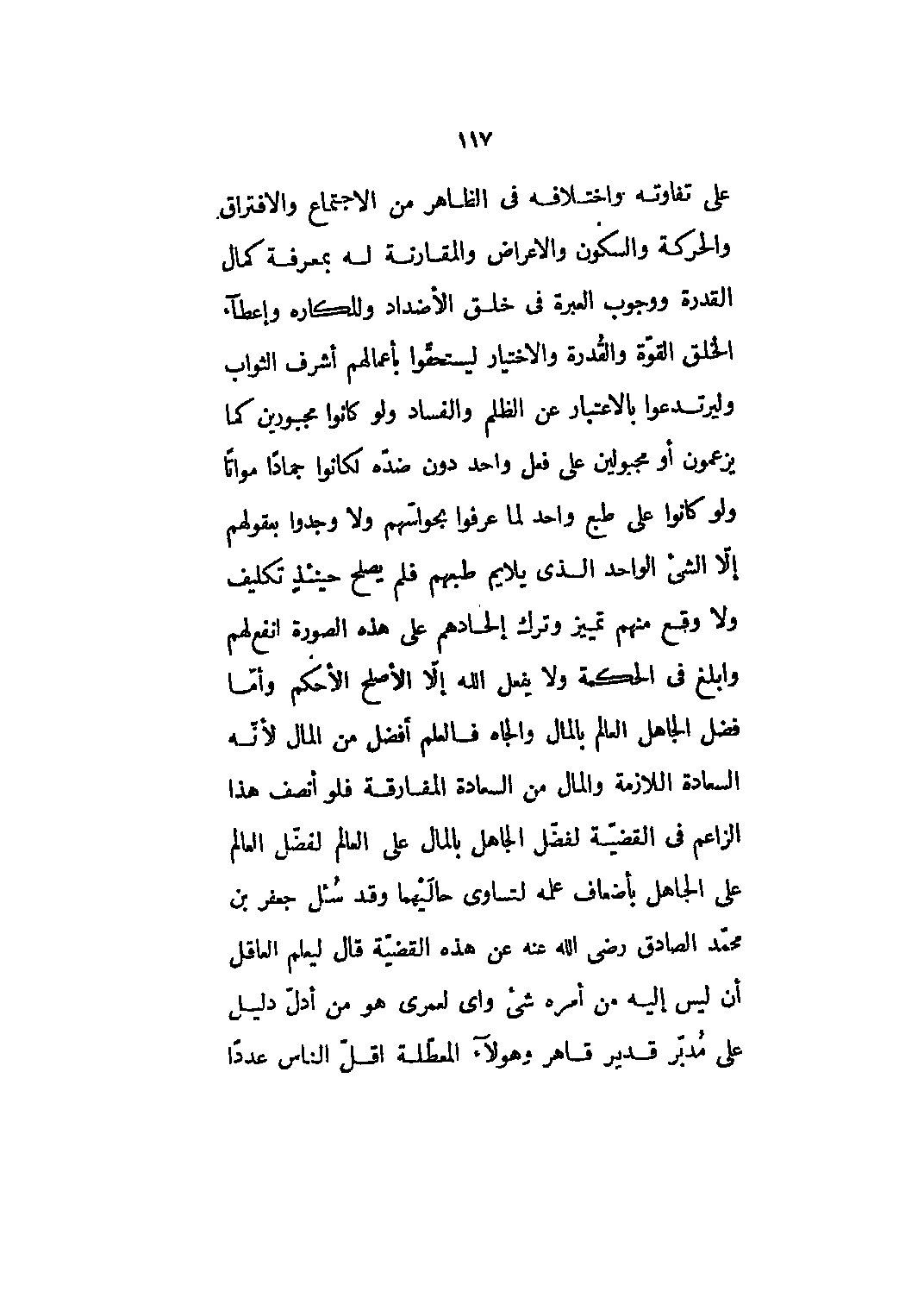 على تفاوته واختلافه في الظاهر من الاجتماع والافتراق والحركة والسكون والأعراض والمقارنة له بمعرفة كمال القدرة ووجوب العبرة في خلق الأضداد وللكاره وإعطاء الخلق القوّة والقدرة والاختيار ليستحقّوا بأعمالهم أشرف الثواب وليرتدعوا بالاعتبار عن الظلم والفساد ولو كانوا مجبورين كما يزعمون أو مجبولين على فعل واحد دون ضدّه لكانوا جماداً مواتاً ولو كانوا على طبع واحد لما عرفوا بحواسّهم ولا وجدوا بعقولهم إلّا الشيء الواحد الّذي يلايم طبعهم فلم يصلح حينئذٍ تكليف ولا وقع منهم تمييز وترك إلحادهم على هذه الصورة أنفع لهم وأبلغ في الحكمة ولا يفعل الله إلاّ الأصلح الأحكم وأمّا فضل الجاهل العالم بالمال والجاه فالعلم أفضل من المال لأنّه السعادة اللازمة والمال من السعادة المفارقة فلو أنصف هذا الزاعم في القضيّة لفضّل الجاهل بالمال على العالم لفضّل العالم على الجاهل بأضعاف علمه لتساوي حالَيْهما وقد سُئل جعفر بن محمد الصادق رضى الله عنه عن هذه القضيّة قال ليعلم العاقل أن ليس إليه من أمره شيء وأي لعمري هو من أدلّ دليل على مُدبّر قدير قاهر وهؤلاء المعطّلة أقلّ الناس عدداً