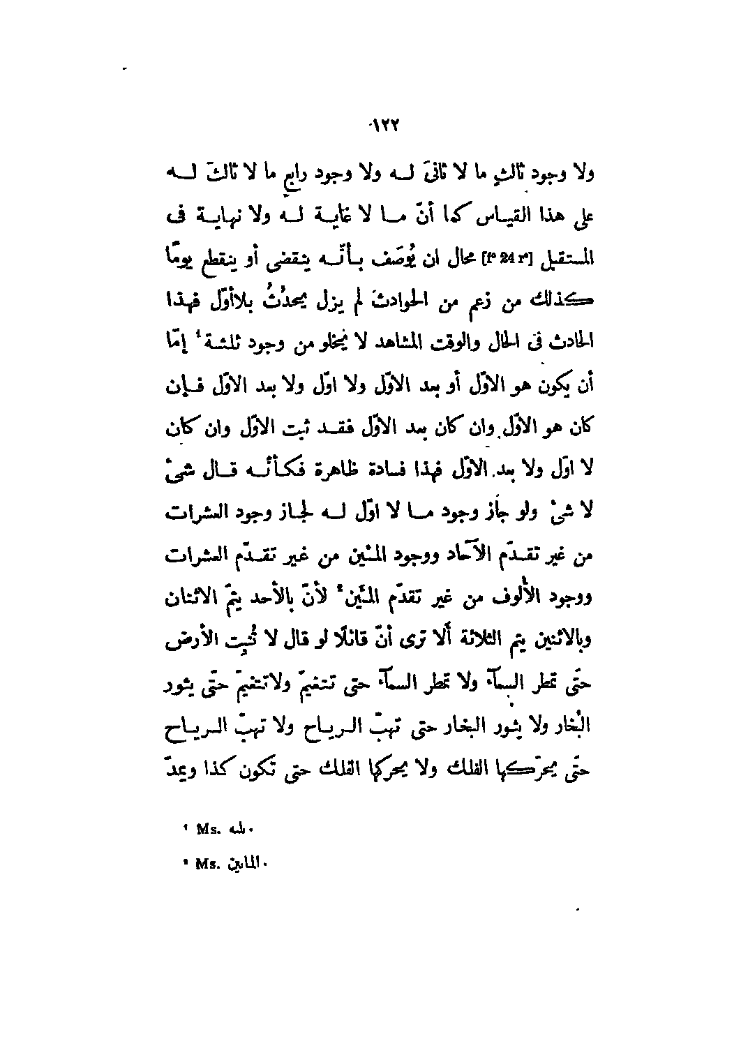 ولا وجود ثالثٍ ما لا ثاني له ولا وجود رابعٍ ما لا ثالثَ له على هذا القياس كما أنّ ما لا غاية له ولا نهاية في المستقبل [24] محال أن يُوصَف بأنّه ينقضي أو ينقطع يوماً كذلك من زعم من الحوادث لم يزل يحدُثُ بلا أوّل فهذا الحادث في الحال والوقت المشاهد لا يخلو من وجود ثلاثة [1] إمّا أن يكون هو الأوّل أو بعد الأوّل ولا أوّل ولا بعد الأوّل فإن كان هو الأوّل وإن كان بعد الأوّل فقد ثبت الأوّل وإن كان لا أوّل ولا بعد الأوّل فهذا فسادة ظاهرة فكأنّه قال شيء لا شيء ولو جاز وجود ما لا أوّل له لجاز وجود العشرات من غير تقدّم الآحاد ووجود المئين من غير تقدّم العشرات ووجود الألوف من غير تقدّم المئّين [2] لأنّ بالأحد يتمّ الاثنان وبالاثنين يتم الثلاثة ألا ترى أنّ قائلاً لو قال لا تُنبِت الأرض حتّى تمطر السماء ولا تمطر السماء حتّى تتغيّم ولا تتغيّم حتّى يثور البُخار ولا يثور البخار حتى تهبّ الرياح ولا تهبّ الرياح حتّى يحرّكها الفلك ولا يحركها الفلك حتى تكون كذا ويمدّ