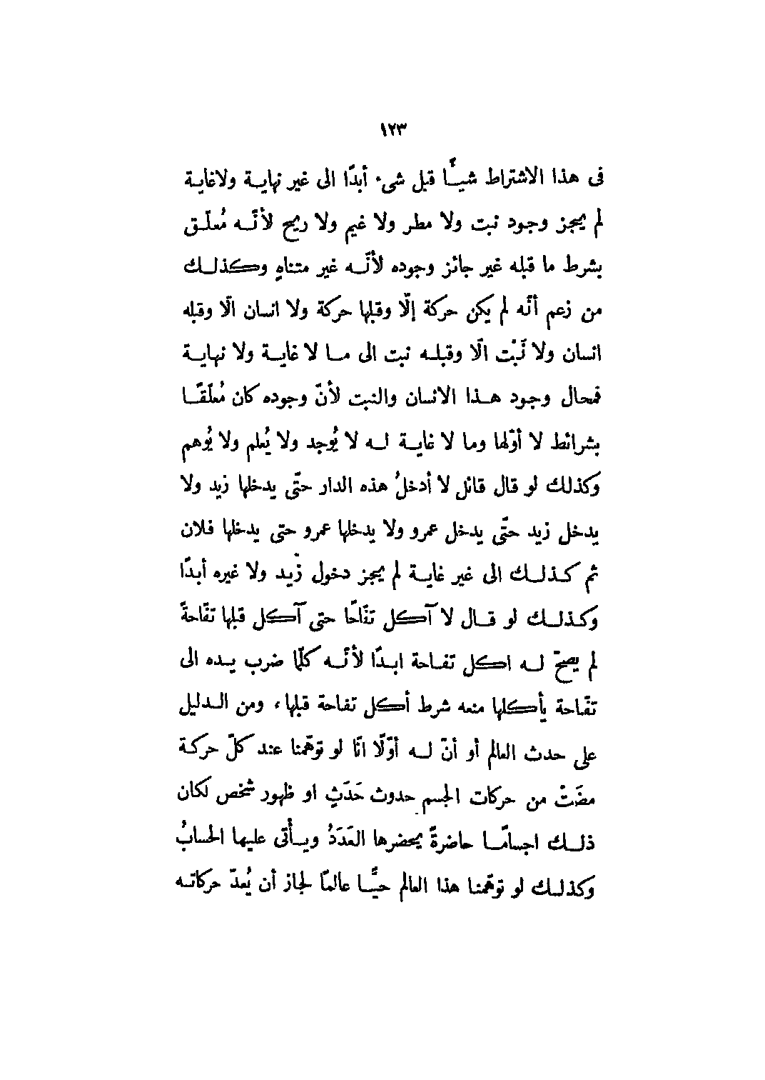 في هذا الاشتراط شيئا قبل شيء أبداً إلى غير نهاية ولا غاية لم يجز وجود نبت ولا مطر ولا غيم ولا ريح لأنّه مُعلّق بشرط ما قبله غير جائز وجوده لأنّه غير متناهٍ وكذلك من زعم أنّه لم يكن حركة إلاّ وقبلها حركة ولا إنسان إلاّ وقبله إنسان ولا نَبْت ألاّ وقبله نبت إلى ما لا غاية ولا نهاية فمحال وجود هذا الإنسان والنبت لأنّ وجوده كان معلّقاً بشرائط لا أوّلها وما لا غاية له لا يُوجد ولا يُعلم ولا يُوهم وكذلك لو قال قائل لا أدخلُ هذه الدار حتّى يدخلها زيد ولا يدخل زيد حتّى يدخل عمرو ولا يدخلها عمرو حتى يدخلها فلان ثم كذلك إلى غير غاية لم يجز دخول زيد ولا غيره أبداً وكذلك لو قال لا آكل تفّاحاً حتى آكل قبلها تفّاحة لم يصحّ له اكل تفاحة ابدا لأنّه كلّما ضرب يده الى تفّاحة يأكلها منعه شرط أكل تفاحة قبلها، ومن الدليل على حدث العالم أو أنّ له أوّلاً أنّا لو توهَمنا عند كلّ حركة مضَتْ من حركات الجسم حدوث حَدَثٍ أو ظهور شخص لكان ذلك أجساماً حاضرةً يحضرها العَدَدُ ويأتي عليها الحسابُ وكذلك لو توّهمنا هذا العالم حيّاً عالماً لجاز أن يُعدّ حركاته