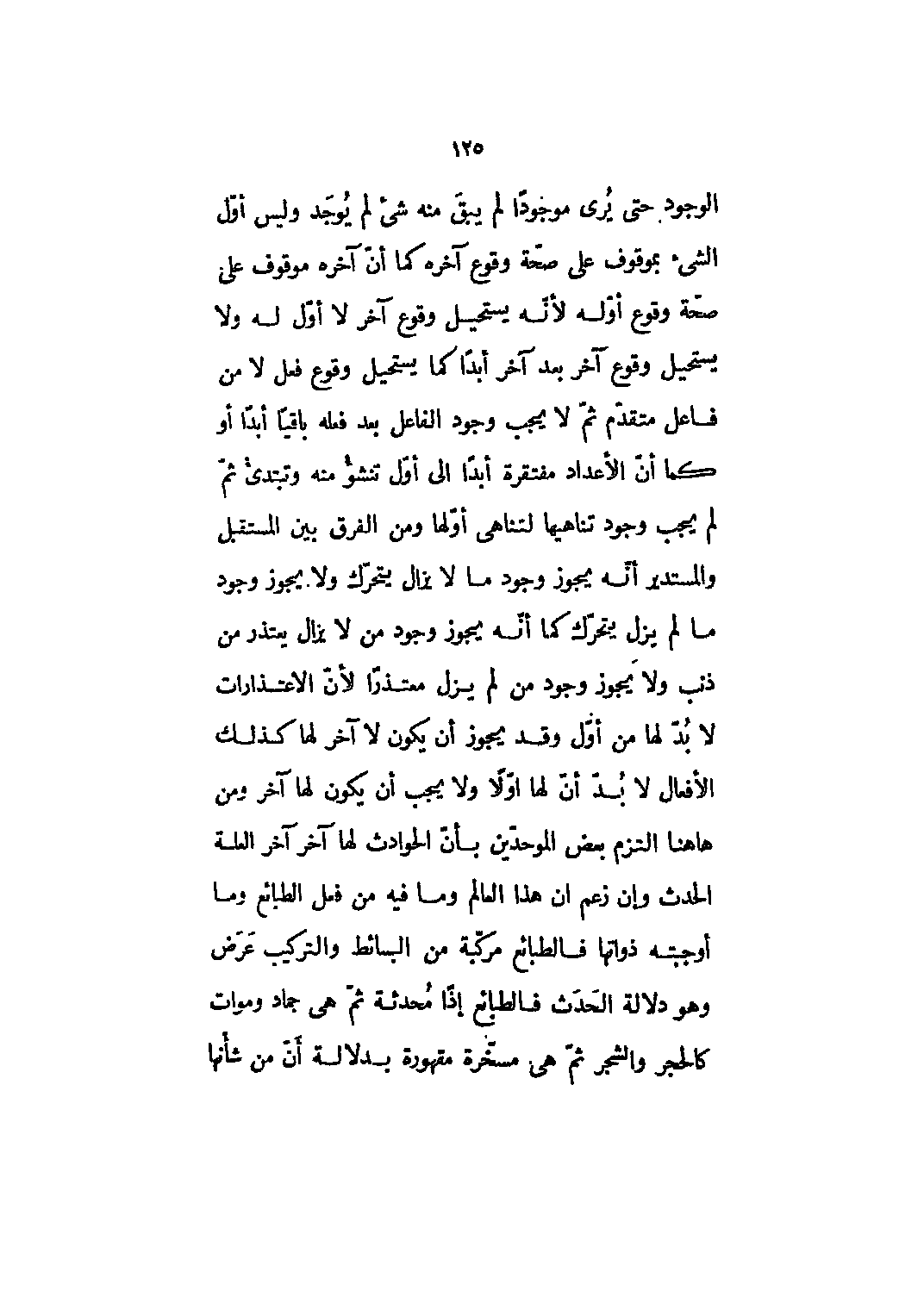 الوجود حتى يرى موجوداً لم يبق منه شيء لم يوجد وليس أول الشيء بموقوف على صحة وقوع آخره كما أن آخره موقوف على صحة وقوع أوله لأنه يستحيل وقوع آخر لا أول له ولا يستحيل وقوع آخر بعد آخر أبداً كما يستحيل وقوع فعل لا من فاعل متقدم ثم لا يجب وجود الفاعل بعد فعله باقياً أبداً أو كما أن الأعداد مفتقرة أبداً إلى أول تنشؤ منه وتبتدئ ثم لم يجب وجود تناهيها لتناهى أولها ومن الفرق بين المستقبل والمستدير أنه يجوز وجود ما لا يزال يتحرك ولا يجوز وجود ما لم يزل يتحرك كما أنه يجوز وجود من لا يزال يعتذر من ذنب ولا يجوز وجود من لم يزل معتذراً لأن الاعتذارات لا بدّ لها من أول وقد يجوز أن يكون لا آخر لها كذلك الأفعال لا بدّ أن لها أولاً ولا يجب أن يكون لها آخر ومن هاهنا التزم بعض الموحدين بأن الحوادث لها آخر آخر العلة الحدث وإن زعم أن هذا العالم وما فيه من فعل الطبائع وما أوجبته ذواتها فالطبائع مركّبة من البسائط والتركيب عرض وهو دلالة الحدث فالطبائع إذاً محدثة ثم هي جماد وموات كالحجر والشجر ثم هي مسخرة مقهورة بدلالة أن من شأنها