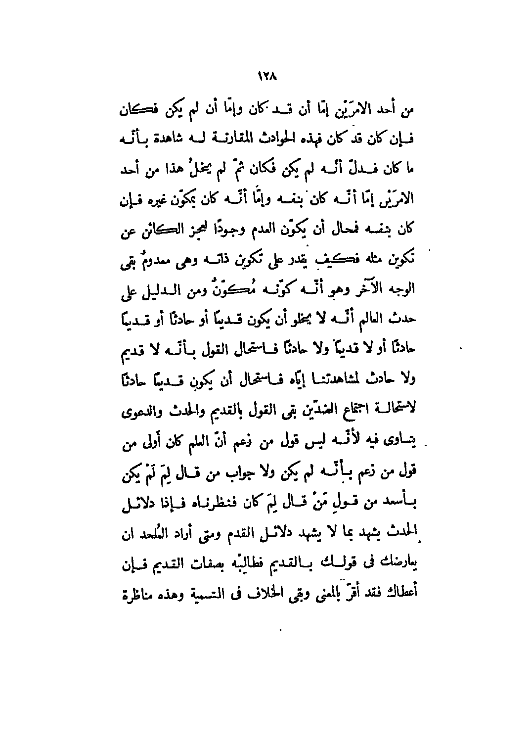 من أحد الأمرين إما أن قد كان وإمّا أن لم يكن فكان فإن كان قد كان فهذه الحوادث المقارنة له شاهدة بأنه ما كان فدل أنّه لم يكن فكان ثمّ لم يخل هذا من أحد الأمرين إما أنه كان بنفسه وإما أنه كان بمكون غيره فإن كان بنفسه فمحال أن يكون العدم وجوداً لعجز الكائن عن تكوين مثله فكيف يقدر على تكوين ذاته وهي معدوم بقي الوجه الآخر وهو أنه كونه مكون ومن الدليل على حدث العالم أنه لا يخلو أن يكون قديماً أو حادثاً أو قديماً حادثاً أو لا قديماً ولا حادثاً فاستحال القول بأنه لا قديم ولا حادث لمشاهدتنا إياه فاستحال أن يكون قديماً حادثاً لاستحالة اجتماع الضدين بقي القول بالقديم والحدث والدعوى يتساوى فيه لأنه ليس قول من زعم أن العلم كان أولى من قول من زعم بأنّه لم يكن ولا جواب من قال لِمَ لَمْ يكن بأسعد من قول مَنْ قال لِمَ كان فنظرناه فإذا دلائل الحدث يشهد بما لا يشهد دلائل القدم ومتى أراد الملحد أن يعارضك في قولك بالقديم فطالبه بصفات القديم فإن أعطاك فقد أقرّ بالمعنى وبقي الخلاف في التسمية وهذه مناظرة