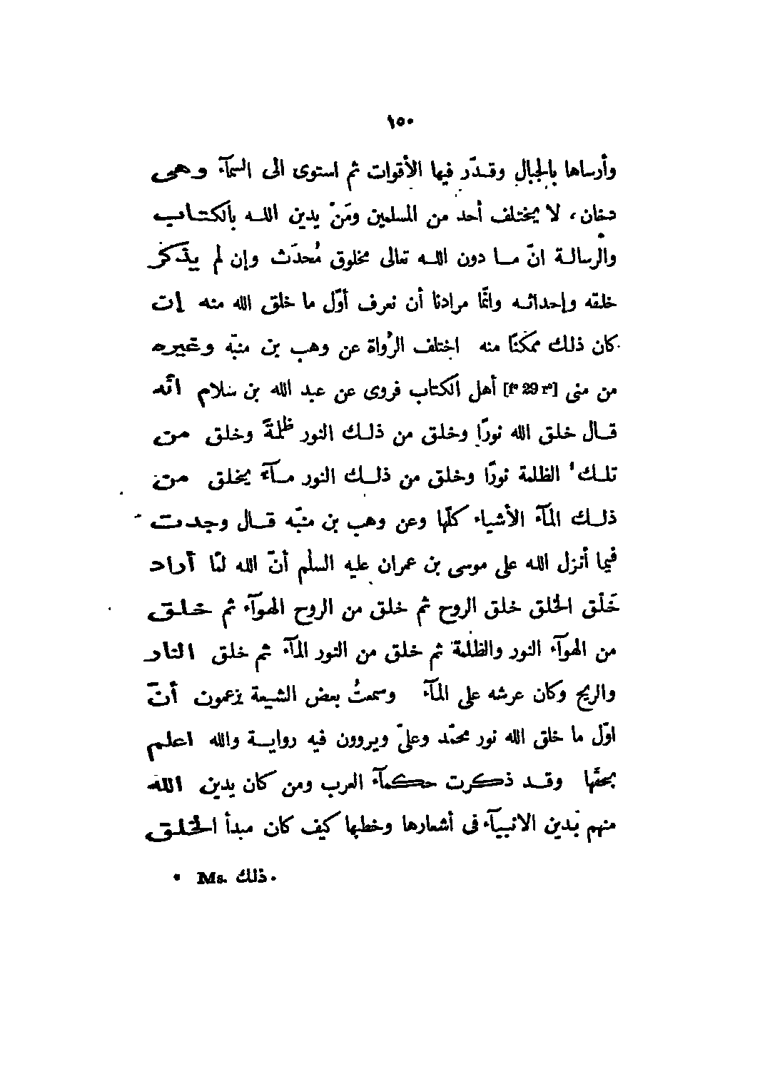 وأرساها بالجبال وقدر فيها الأقوات ثم استوى الى السماء وهي دخان، لا يختلف أحد من المسلمين ومن يدين الله بالكتاب والرسالة أن ما دون الله تعالى مخلوق محدث وإن لم يذكر خلقه وإحداثه وإنما مرادنا أن نعرف أول ما خلق الله منه إن كان ذلك ممكناً منه اختلف الرواة عن وهب بن منبه وغيره من منى [29] أهل الكتاب فروى عن عبد الله بن سلام أنه قال خلق الله نوراً وخلق من ذلك النور ظلمةً وخلق من تلك [1] الظلمة نوراً وخلق من ذلك النور ماءً يخلق من ذلك الماء الأشياء كلها وعن وهب بن منبه قال وجدت فيما أنزل الله على موسى بن عمران عليه السلم أن الله لما أراد خلق الخلق خلق الروح ثم خلق من الروح الهواء ثم خلق من الهواء النور والظلمة ثم خلق من النور الماء ثم خلق النار والريح وكان عرشه على الماء وسمعت بعض الشيعة يزعمون أن أول ما خلق الله نور محمّد وعليّ ويروون فيه رواية والله اعلم بحقها وقد ذكرت حكماء العرب ومن كان يدين الله منهم بدين الأنبياء في أشعارها وخطبها كيف كان مبدأ الخلق