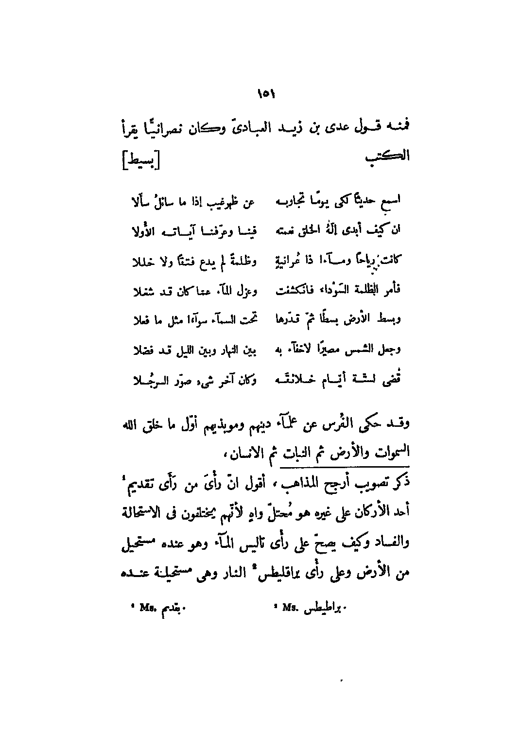 أقول أن رأى من رأى تقديم [1] أحد الأركان على غيره هو محتلّ واه لأنّهم يختلفون في الاستحالة والفساد وكيف يصح على رأي تاليس الماء وهو عنده مستحيل من الأرض وعلى رأي يراقليطس [2] النار وهي مستحيلة عنده