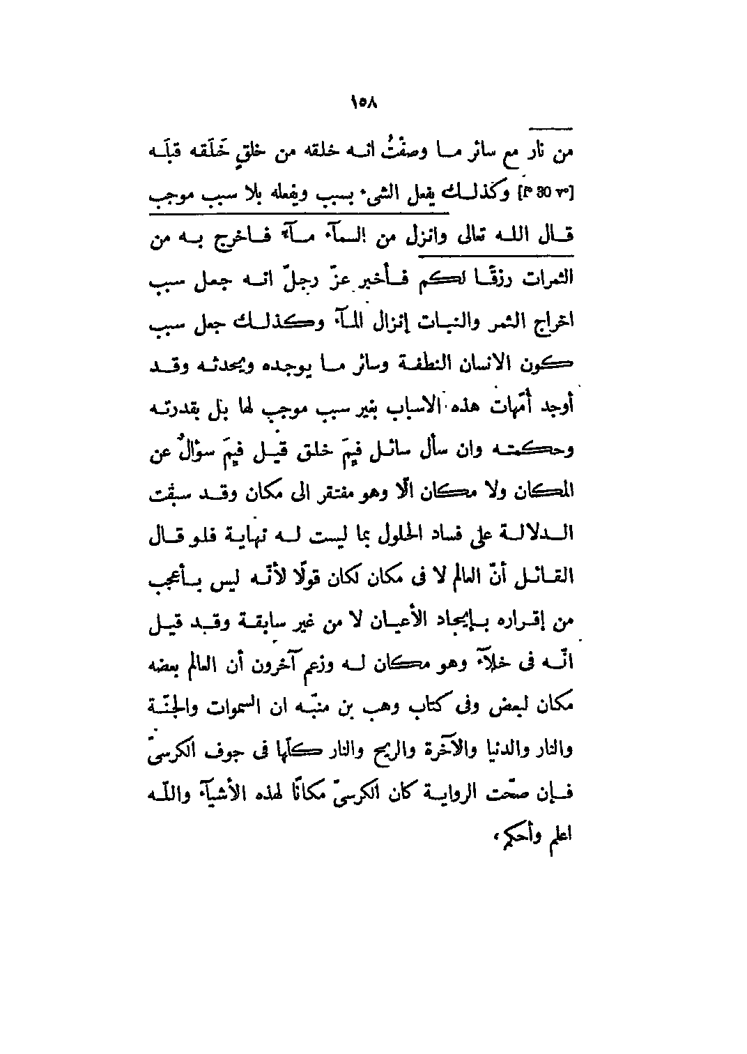 من نارٍ 55: 14- 15 مع سائر ما وصفت أنه خلقه من خلق خلقه قبله [30] وكذلك يفعل الشيء بسبب ويفعله بلا سبب موجب قال الله تعالى وَأَنْزَلَ من السَّماءِ ماء فَأَخْرَجَ به من الثَّمَراتِ رِزْقاً لَكُمْ 2: 22 فأخبر عز وجل أنه جعل سبب إخراج الثمر والنبات إنزال الماء وكذلك جعل سبب كون الإنسان النطفة وسائر ما يوجده ويحدثه وقد أوجد أمهات هذه الأسباب بغير سبب موجب لها بل بقدرته وحكمته وإن سأل سائل فيم خلق قيل فيم سؤال عن المكان ولا مكان ألا وهو مفتقر إلى مكان وقد سبقت الدلالة على فساد الحلول بما ليست له نهاية فلو قال القائل أن العالم لا في مكان لكان قولاً لأنه ليس بأعجب من إقراره بإيجاد الأعيان لا من غير سابقة وقد قيل أنه في خلاء وهو مكان له وزعم آخرون أن العالم بعضه مكان لبعض وفي كتاب وهب بن منبه أن السموات والجنة والنار والدنيا والآخرة والريح والنار كلها في جوف الكرسي فإن صحت الرواية كان الكرسي مكاناً لهذه الأشياء والله اعلم وأحكم،
