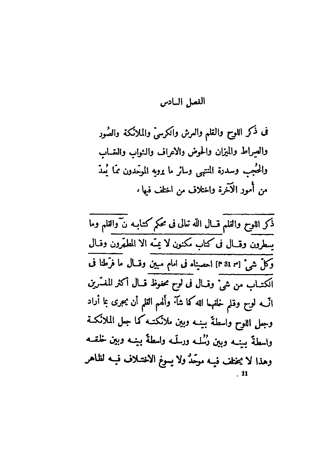 الفصل السادس في ذكر اللوح والقلم والعرش والكرسيّ والملائكة والصور والصراط والميزان والحوض والأعراف والثواب والعقاب والحجب وسدرة المنتهى وسائر ما يرويه الموحدون مما يعد من أمور الآخرة واختلاف من اختلف فيها،