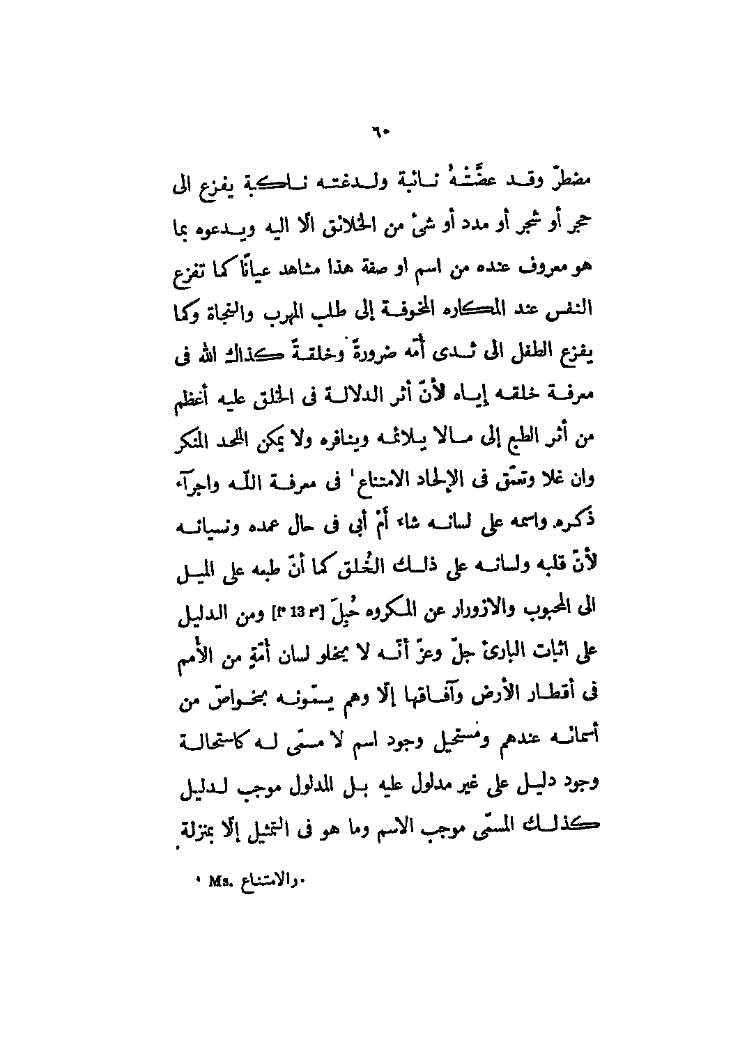 مضطرّ وقد عضّته نائبة ولد غته ناكبة يفزع إلى حجر أو شجر أو مدد أو شيء من الخلائق إلا إليه ويدعوه بما هو معروف عنده من اسم أو صفة هذا مشاهد عياناً كما تفزع النفس عند المكاره المخوفة إلى طلب المهرب والنجاة وكما يفزع الطفل إلى ثدي أمه ضرورة وخلقه كذاك الله في معرفة خلقه إياه لأن أثر الدلالة في الخلق عليه أعظم من أثر الطبع إلى ما لا يلائمه وينافره ولا يمكن الملحد المنكر وان غلا وتعمّق في الإلحاد الامتناع [1] في معرفة الله وإجراء ذكره واسمه على لسانه شاء أم أبى في حال عمده ونسيانه لأن قلبه ولسانه على ذلك الخلق كما أنّ طبعه على الميل إلى المحبوب والازورار عن المكروه حبل [13] ومن الدليل على إثبات البارئ جل وعز أنه لا يخلو لسان أمة من الأمم في أقطار الأرض وآفاقها إلا وهم يسمونه بخواص من أسمائه عندهم ومستحيل وجود اسم لا مسمى له كاستحالة وجود دليل على غير مدلول عليه بل المدلول موجب لدليل كذلك المسمى موجب الاسم وما هو في التمثيل إلّا بمنزلة