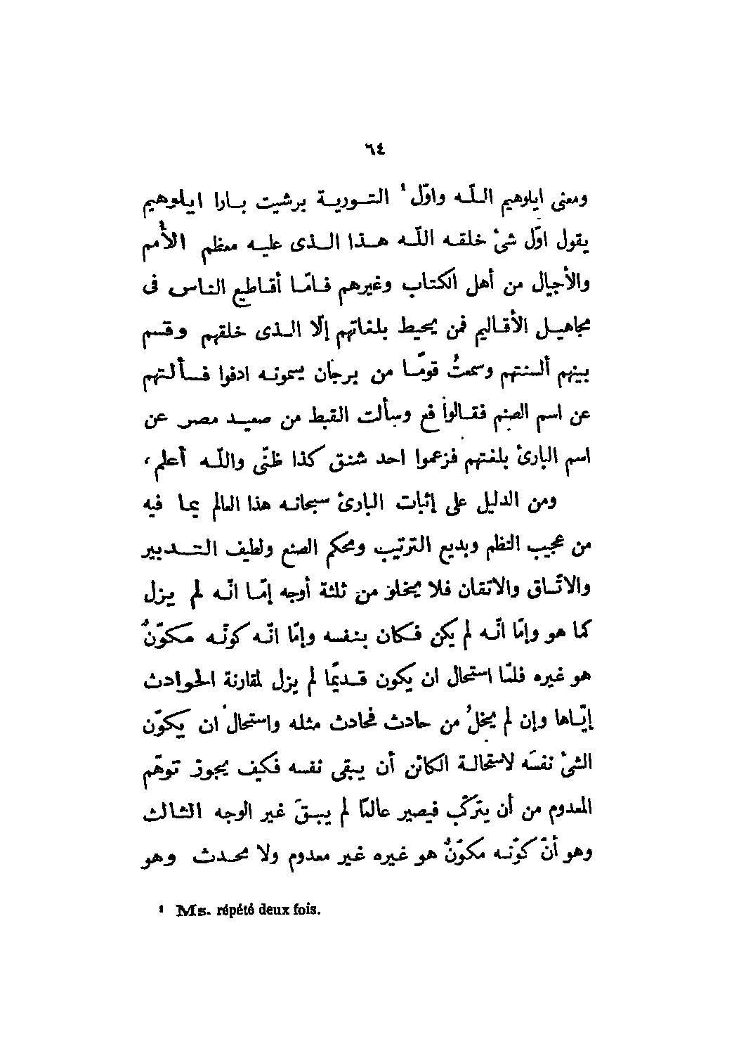 ومعنى ايلوهيم الله وأوّل [1] التوراة برشيت بارا ايلوهيم يقول أول شيء خلقه الله هذا الذي عليه معظم الأمم والأجيال من أهل الكتاب وغيرهم فأما أقاطيع الناس في مجاهيل الأقاليم فمن يحيط بلغاتهم إلا الذي خلقهم وقسم بينهم ألسنتهم وسمعت قوما من برجان يسمونه ادفوا فسألتهم عن اسم الصنم فقالوا فع وسألت القبط من صعيد مصر عن اسم البارئ بلغتهم فزعموا أحد شنق كذا ظني والله أعلم، ومن الدليل على إثبات البارئ سبحانه هذا العالم بما فيه من عجيب النظم وبديع الترتيب ومحكم الصنع ولطيف التدبير والاتساق والإتقان فلا يخلو من ثلاثة أوجه إما أنه لم يزل كما هو وإما أنه لم يكن فكان بنفسه وإما أنه كونه مكون هو غيره فلما استحال أن يكون قديماً لم يزل لمقارنة الحوادث إياها وإن لم يخل من حادث فحادث مثله واستحال أن يكون الشيء نفسه لاستحالة الكائن أن يبقى نفسه فكيف يجوز توهم المعدوم من أن يتركب فيصير عالماً لم يبق غير الوجه الثالث وهو أنّ كوّنه مكوّنٌ هو غيره غير معدوم ولا محدث وهو
