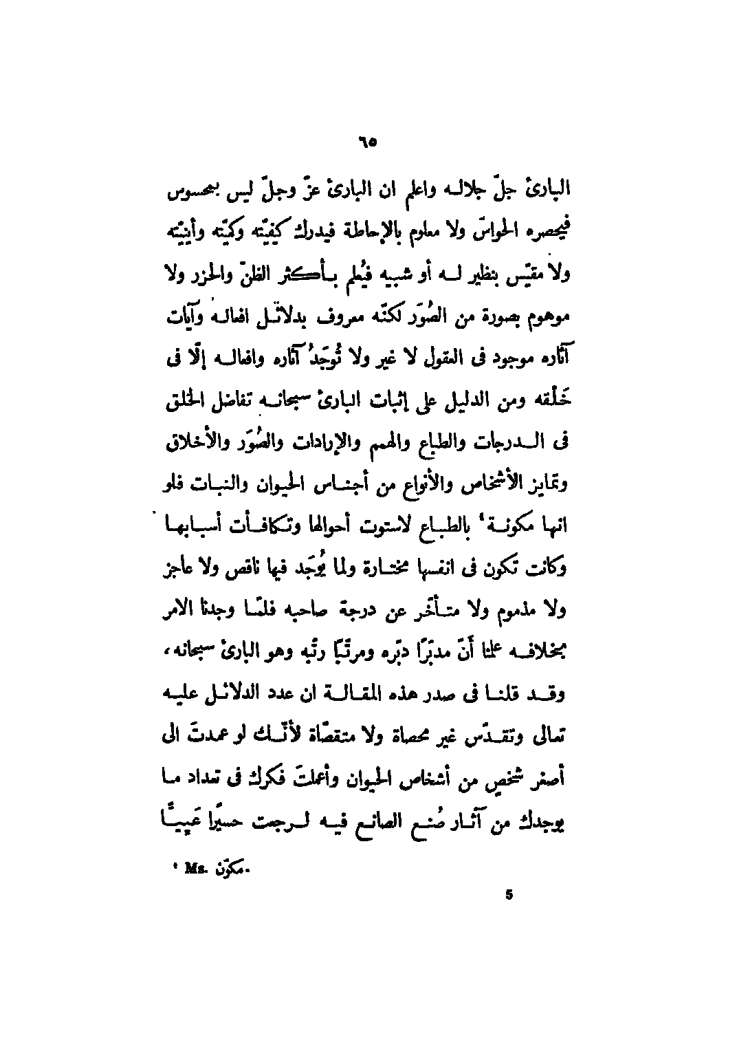 البارئ جلّ جلاله واعلم أن البارئ عزّ وجلّ ليس بمحسوس فيحصره الحواسّ ولا معلوم بالإحاطة فيدرك كيفيّته وكميته وأينيّته ولا مقيّس بنظير له أو شبيه فُيعلم بأكثر الظنّ والحزر ولا موهوم بصورة من الصّوَر لكنّه معروف بدلائل أفعاله وآيات آثاره موجود في العقول لا غير ولا تُوجَدُ آثاره وأفعاله إلاّ في خَلْقه ومن الدليل على إثبات البارئ سبحانه تفاضل الخلق في الدرجات والطباع والهمم والإرادات والصُوَر والأخلاق وتمايز الأشخاص والأنواع من أجناس الحيوان والنبات فلو أنها مكونة [1] بالطباع لاستوت أحوالها وتكافأت أسبابها وكانت تكون في أنفسها مختارة ولما يُوجَد فيها ناقص ولا عاجز ولا مذموم ولا متأخّر عن درجة صاحبه فلمّا وجدنا الأمر بخلافه علمنا أنّ مدبّراً دبّره ومرتّباً رتّبه وهو البارئ سبحانه، وقد قلنا في صدر هذه المقالة إن عدد الدلائل عليه تعالى وتقدّس غير محصاة ولا متقصّاة لأنّك لو عمدتَ إلى أصغر شخص من أشخاص الحيوان وأعملت فكرك في تعداد ما يوجدك من آثار صنع الصانع فيه لرجعت حسيرا عييّا