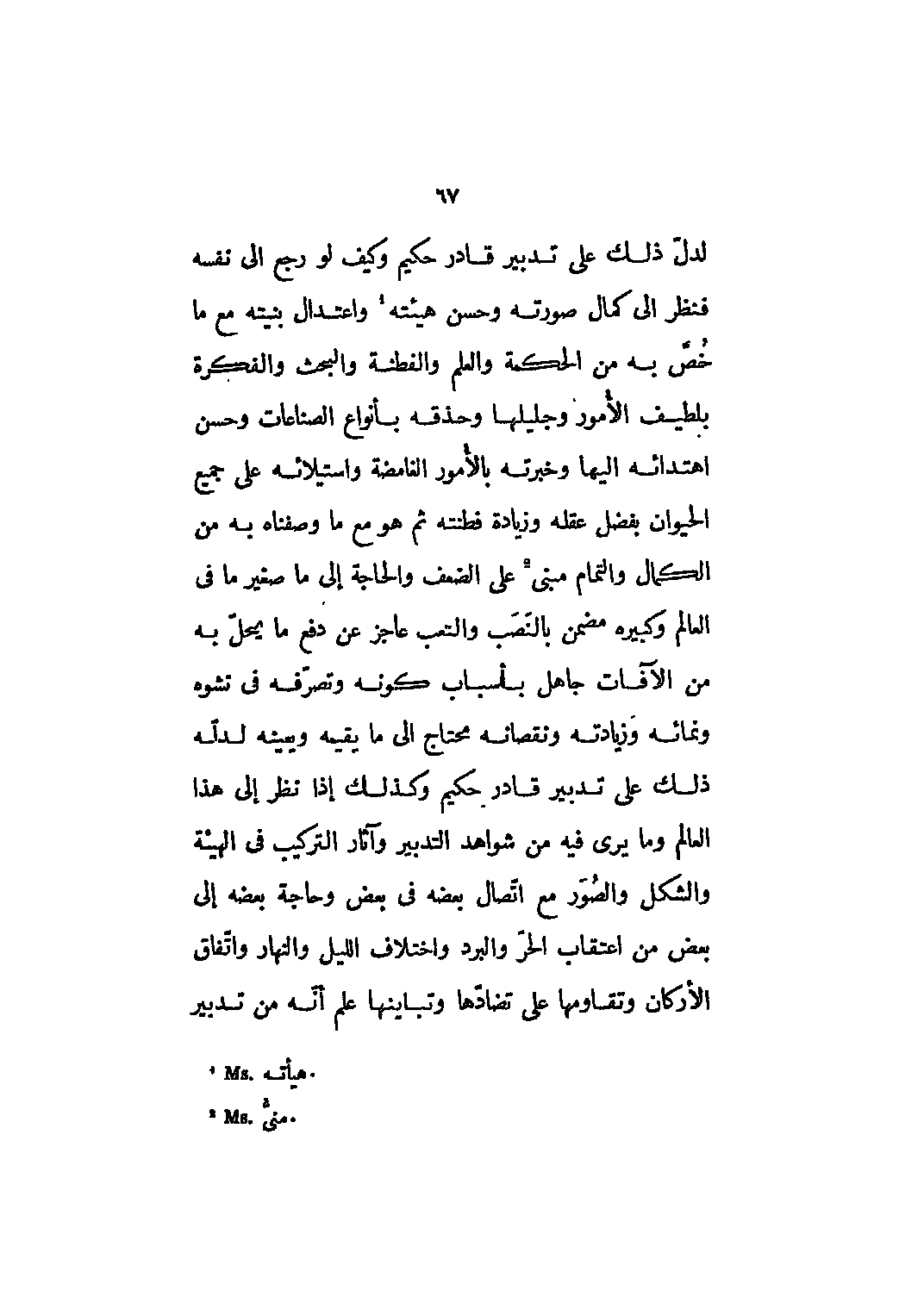 لدلّ ذلك على تدبير قادر حكيم وكيف لو رجع إلى نفسه فنظر إلى كمال صورته وحسن هيئته [1] واعتدال بنيته مع ما خُصَّ به من الحكمة والعلم والفطنة والبحث والفكرة بلطيف الأُمور وجليلها وحذقه بأنواع الصناعات وحسن اهتدائه إليها وخبرته بالأمور الغامضة واستيلائه على جميع الحيوان بفضل عقله وزيادة فطنته ثم هو مع ما وصفناه به من الكمال والتمام مبني [2] على الضعف والحاجة إلى ما صغير ما في العالم وكبيره مضمن بالنَصَب والتعب عاجز عن دفع ما يحلّ به من الآفات جاهل بأسباب كونه وتصرفه في نشوه ونمائه وزيادته ونقصانه محتاج إلى ما يقيمه ويعينه لدلّه ذلك على تدبير قادر حكيم وكذلك إذا نظر إلى هذا العالم وما يرى فيه من شواهد التدبير وآثار التركيب في الهيئة والشكل والصُور مع اتّصال بعضه في بعض وحاجة بعضه إلى بعض من اعتقاب الحرّ والبرد واختلاف الليل والنهار واتفاق الأركان وتقاومها على تضادّها وتباينها علم أنّه من تدبير