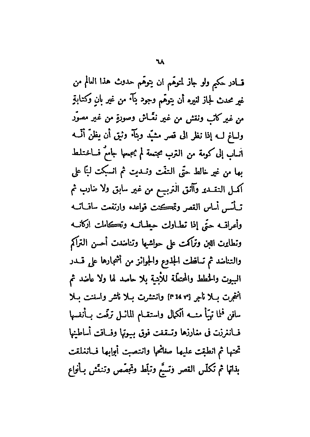 قادر حكيم ولو جاز لمتوّهم أن يتوهّم حدوث هذا العالم من غير محدث لجاز لغيره أن يتوهّم وجود بناء من غير بانٍ وكتابةٍ من غير كاتب ونقش من غير نقّاش وصورةٍ من غير مصوّر ولساغ له إذا نظر إلى قصر مشيّد وبناء وثيق أن يظنّ أنّه انساب إلى كومة من الترب مجتمعة لم يجمعها جامعٌ فاختلط بها من غير خالط حتّى التفّت ونديت ثم انسبكت لبنا على أكمل التقدير وآنق التربيع من غير سابق ولا ضارب ثم تأسّس أساس القصر وتمكنت قواعده وارتفعت ساقاته وأعراقه حتّى إذا تطاولت حيطانه وتكاملت أركانه وتطايرت اللبن وتراكمت على حواشيها وتناضدت أحسن التراكم والتناضد ثم تساقطت الجذوع والجوائز من أشجارها على قدر البيوت والخطط والمحتطّة للأبنية بلا حاصد لها ولا عاضد ثم انتجرت بلا ناجر [14] وانتشرت بلا ناشر واسفنت بلا سافن فلما تهيّأ منه الكمال واستقام المائل ترفّعت بأنفسها فانغرزت في مغارزها وتسقفت فوق بيوتها وفاقت أساطينها تحتها ثم انطبقت عليها صفائحها وانتصبت أبوابها فانغلقت بذاتها ثم تكلّس القصر وتسيّع وتبلّط وتجصًّص وتنقّش بأنواع