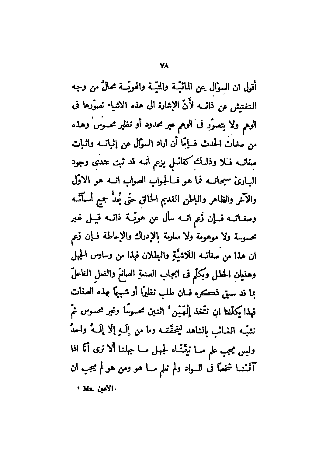 أقول أن السؤال عن المائيّة والمنيّة والهويّة محالٌ من وجه التفتيش عن ذاته لأنّ الإشارة إلى هذه الأشياء تصوّرها في الوهم ولا يتصوّر في الوهم غير محدود أو نظير محسوس وهذه من صفات الحدث فإمّا أن أراد السؤال عن إثباته وإثبات صفاته فلا وذلك كقائل يزعم أنه قد ثبت عندي وجود البارئ سبحانه فما هو فالجواب الصواب أنه هُوَ الْأَوَّلُ وَالْآخِرُ وَالظَّاهِرُ وَالْباطِنُ 57: 3 القديم الخالق حتى يُعدُّ جميع أسمائه وصفاته فإن زعم أنه سأل عن هويّة ذاته قيل غير محسوسة ولا موهومة ولا معلومة بالإدراك والإحاطة فإن زعم أن هذا من صفاته الاشيّة والبطلان فهذا من وساوس الجهل وهذيان الخطل ويكلّم في إيجاب الصنعة الصانع والفعل الفاعل بما قد سبق ذكره فإن طلب نظيراً أو شبيهاً بهذه الصفات فهذا يكلّفنا أن نتّخذ إلهين [1] اثنين محسوساً وغير محسوس ثمّ نشبّه الغائب بالشاهد ليتحقّقه وما من إلهٍ إلّا إله واحد وليس يجب علم ما تيقّنّاه لجهل ما جهلنا ألا ترى أنّا إذا آنَسْنا شخصاً في السواد ولم نعلم ما هو ومن هو لم يجب ان