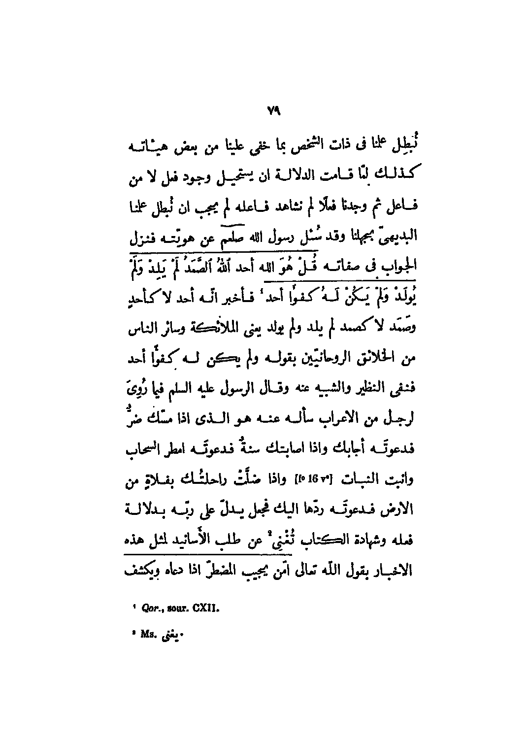 نُبطِل علمنا في ذات الشخص بما خفي علينا من بعض هيئاته كذلك لمّا قامت الدلالة أن يستحيل وجود فعل لا من فاعل ثم وجدنا فعلاً لم نشاهد فاعله لم يجب أن نُبطل علمنا البديهيّ بجهلنا وقد سئل رسول الله صلى الله عليه وسلم عن هويّته فنزل الجواب في صفاته قُلْ هُوَ الله أَحَدٌ الله الصَّمَدُ لَمْ يَلِدْ وَلَمْ يُولَدْ وَلَمْ يَكُنْ لَهُ كُفُواً أَحَدٌ 112: 1- 4 [1] فأخبر أنّه أحد لا كأحدٍ وصَمَد لا كصمد لم يلد ولم يولد يعني الملائكة وسائر الناس من الخلائق الروحانيّين بقوله ولم يكن له كفؤاً أحد فنفى النظير والشبيه عنه وقال الرسول عليه السلم فيما رُوِيَ لرجل من الأعراب سأله عنه هو الذي إذا مسّك ضرٌّ فدعوتَه أجابك وإذا أصابتك سنةً فدعوتَه امطر السحاب وأنبت النبات [16] وإذا ضلَّتْ راحلتُك بفلاةٍ من الأرض فدعوتَه ردّها إليك فجعل يدلّ على ربّه بدلالة فعله وشهادة الكتاب تُغْنِيْ [2] عن طلب الأسانيد لمثل هذه الأخبار بقول الله تعالى أَمَّنْ يُجِيبُ الْمُضْطَرَّ إِذا دَعاهُ وَيَكْشِفُ السُّوءَ 27: 62