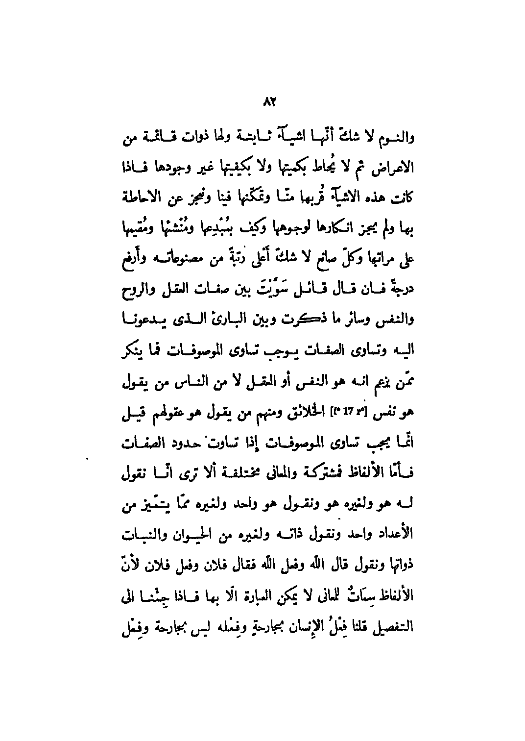 والنوم لا شكّ أنّها أشياء ثابتة ولها ذوات قائمة من الأعراض ثم لا يُحاط بكميتها ولا بكيفيتها غير وجودها فإذا كانت هذه الأشياء قُربها منّا وتمكّنها فينا ونعجز عن الاحاطة بها ولم يجز إنكارها لوجوهها وكيف بمُبْدِعها ومُنْشئها ومُقيمها على مراتبها وكلّ صانع لا شكّ أَعْلى رتبةً من مصنوعاته وأَرفع درجةً فإن قال قائل سَوَّيْتَ بين صفات العقل والروح والنفس وسائر ما ذكرت وبين البارئ الذي يدعونا إليه وتساوي الصفات يوجب تساوي الموصوفات فما ينكر ممّن يزعم أنه هو النفس أو العقل لا من الناس من يقول هو نفس [17] الخلائق ومنهم من يقول هو عقولهم قيل إنما يجب تساوي الموصوفات إذا تساوت حدود الصفات فأمّا الألفاظ فمشتركة والمعاني مختلفة ألا ترى أنّا نقول له هو ولغيره هو ونقول هو واحد ولغيره ممّا يتميّز من الأعداد واحد ونقول ذاته ولغيره من الحيوان والنبات ذواتها ونقول قال الله وفعل الله فقال فلان وفعل فلان لأنّ الألفاظ سِمَاتٌ للمعاني لا يمكن العبارة إلاّ بها فإذا جِئْنا إلى التفصيل قلنا فِعْلُ الإِنسان بجارحةٍ وفِعْله ليس بجارحة وفعل