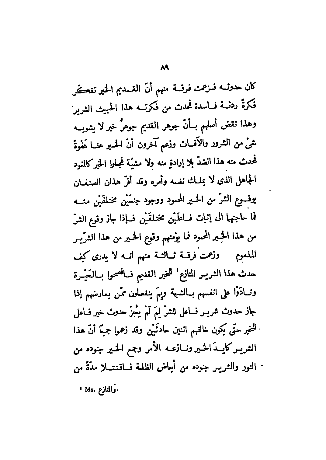 كان حدوثه فزعمت فرقة منهم أنّ القديم الخير تفكّر فكرةً رديئة فاسدة فحدث من فكرته هذا الخبيث الشرير وهذا نقض أصلهم بأنّ جوهر القديم جوهرٌ خير لا يشوبه شيء من الشرور والآفات وزعم آخرون أنّ الخير هفا هَفْوةً فحدث منه هذا الضدّ بلا إرادةٍ منه ولا مشيّة فجعلوا الخير كالمغود الجاهل الذي لا يملك نفسه وأمره وقد أقرّ هذان الصنفان بوقوع الشرّ من الخير المحمود ووجود جنسَيْن مختلفَيْن منه فما حاجتهما إلى إثبات فاعلَيْن مختلفَيْن فإذا جاز وقوع الشرّ من هذا الخير المحمود فما يؤمنهم وقوع الخير من هذا الشرّير المذموم وزعمت فرقة ثالثة منهم أنه لا يدري كيف حدث هذا الشرّير المنازع [1] للخير القديم فأفصحوا بالحَيْرة ونادوا على أنفسهم بالشبهة وبم ينفصون ممّن يعارضهم إذا جاز حدوث شرير فاعل للشرّ لِمَ لَمْ يُجْز حدوث خير فاعل للخير حتّى يكون خالقهم اثنين حادثَيْن وقد زعموا جميعاً أنّ هذا الشرير كايدَ الخير ونازعه الأمر وجمع الخير جنوده من النور والشرير جنوده من أبعاض الظلمة فاقتتلا مدَةً من