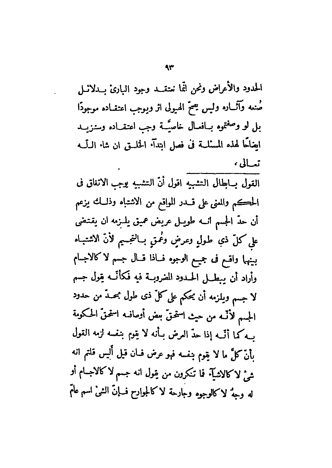 أقول أن التشبيه يوجب الاتفاق في الحكم والمعنى على قدر المواقع من الاشتباه وذلك يزعم أن حد الجسم أنه طويل عريض عميق يلزمه أن يقتضي على كل ذي طول وعرض وعمق بالتجسيم لأن الاشتباه بينهما واقع في جميع الوجوه فإذا قال جسم لا كالأجسام وأراد أن يبطل الحدود المضروبة فيه فكأنه يقول جسم لا جسم ويلزمه أن يحكم على كل ذي طول بحد من حدود الجسم لأنه من حيث استحق بعض أوصافه استحق الحكومة به كما أنه إذا حد العرض بأنه لا يقوم بنفسه لزمه القول بأن كل ما لا يقوم بنفسه فهو عرض فإن قيل أليس قلتم أنه شيء لا كالأشياء فما تنكرون من يقول أنه جسم لا كالأجسام أو له وجه لا كالوجوه وجارحة لا كالجوارح فإن الشيء اسم عام