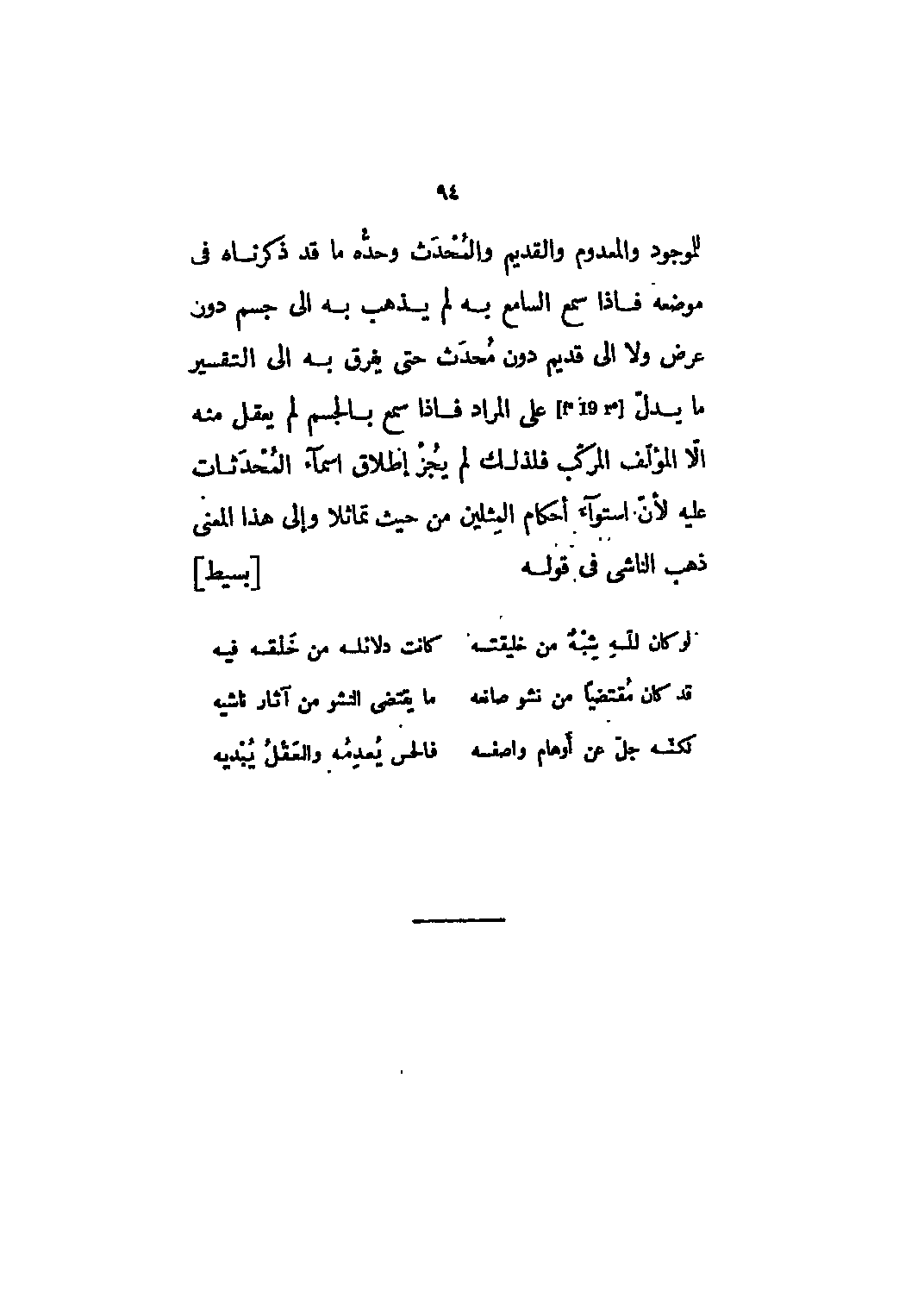 للموجود والمعدوم والقديم والمحدث وحده ما قد ذكرناه في موضعه فإذا سمع السامع به لم يذهب به إلى جسم دون عرض ولا إلى قديم دون محدث حتى يفرق به إلى التفسير ما يدل [19] على المراد فإذا سمع بالجسم لم يعقل منه إلا المؤلف المركب فلذلك لم يجز إطلاق أسماء المحدثات عليه لأن استواء أحكام المثلين من حيث تماثلا وإلى هذا المعنى ذهب الناشي في قوله [بسيط]