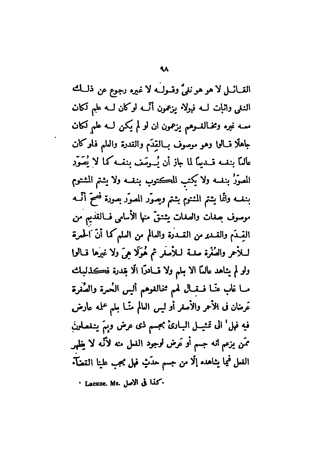 القائل لا هو هو نفي وقوله لا غيره رجوع عن ذلك النفي وإثبات له فهولاء يزعمون أنه لو كان له علم لكان معه غيره ومخالفوهم يزعمون ان لو لم يكن له علم لكان جاهلاً قالوا وهو موصوف بالقدم والقدرة والعلم فلو كان عالماً بنفسه قديماً لما جاز أن يوصف بنفسه كما لا يصور المصور بنفسه ولا يكتب المكتوب بنفسه ولا يشتم المشتوم بنفسه وإنما يشتم المشتوم بشتم ويصوّر المصوّر بصورة فصح أنه موصوف بصفات والصفات يشتق منها الأسامي فالقديم من القدم والقدير من القدرة والعالم من العلم كما أن الحمرة للأحمر والصفرة صفة للأصفر ثم هولا هي ولا غيرها قالوا ولو لم يشاهد عالماً إلا بعلم ولا قادراً إلا بقدرة فكذلك ما غاب عنا فقال لهم مخالفوهم أليس الحمرة والصفرة عرضان في الأحمر والأصفر أو ليس العالم منا بعلم علمه عارض فيه فهل [1] إلى تمثيل البارئ بجسم ذي عرض وبم ينفصلون ممن يزعم أنه جسم أو عرض لوجود الفعل منه لأنه لا يظهر الفعل فيما يشاهد إلا من جسم حدث فهل يجب علينا القضاء