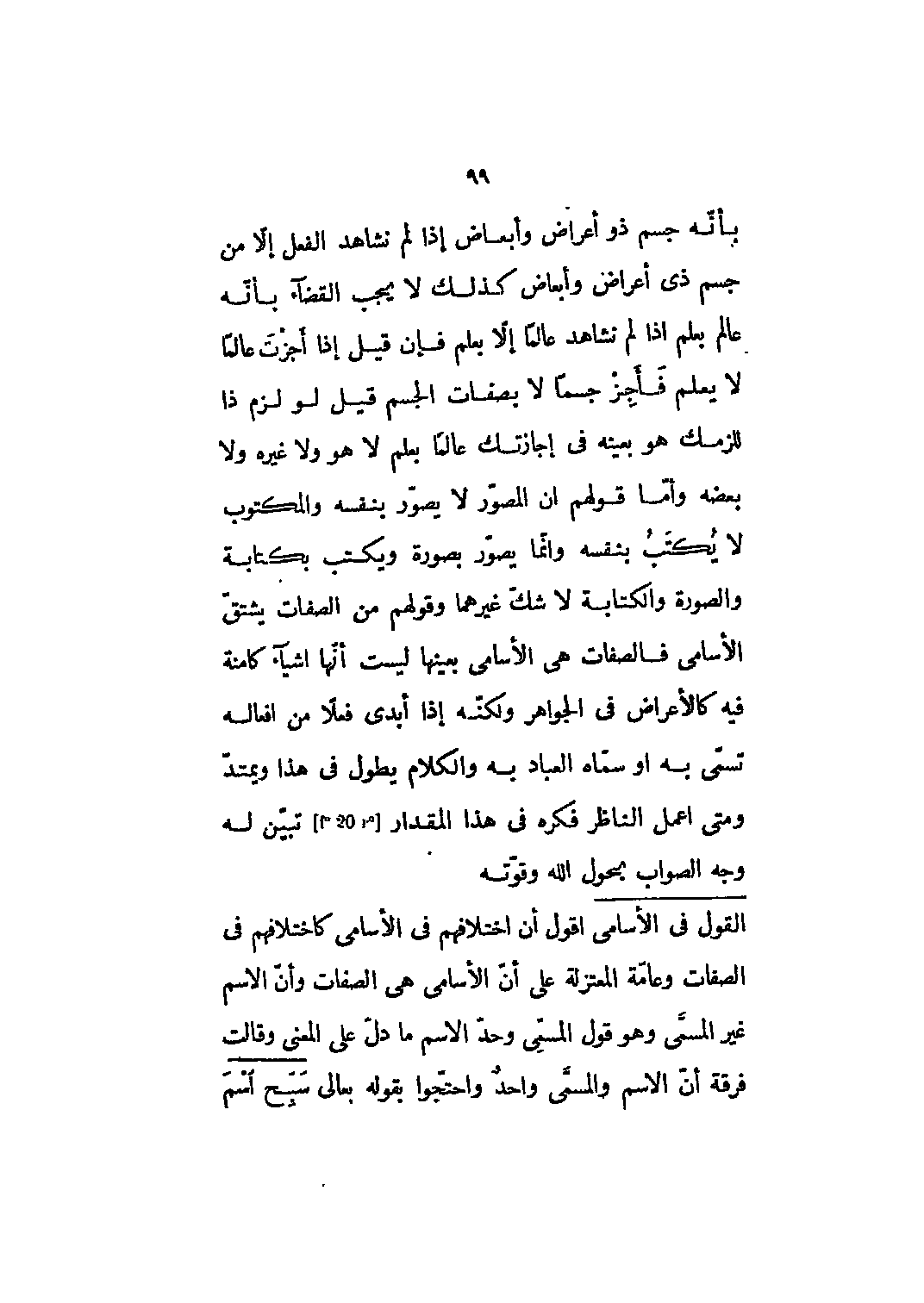 بأنه جسم ذو أعراض وأبعاض إذا لم نشاهد الفعل إلا من جسم ذي أعراض وأبعاض كذلك لا يجب القضاء بأنه عالم بعلم إذا لم نشاهد عالماً إلا بعلم فإن قيل إذا أجزت عالماً لا يعلم فأجز جسماً لا بصفات الجسم قيل لو لزم ذا للزمك هو بعينه في إجازتك عالما بعلم لا هو ولا غيره ولا بعضه وأما قولهم أن المصور لا يصور بنفسه والمكتوب لا يكتب بنفسه وإنما يصور بصورة ويكتب بكتابة والصورة والكتابة لا شكّ غيرهما وقولهم من الصفات يشتق الأسامي فالصفات هي الأسامي بعينها ليست أنها أشياء كامنة فيه كالأعراض في الجواهر ولكنه إذا أبدى فعلاً من أفعاله تسمى به أو سماه العباد به والكلام يطول في هذا ويمتد ومتى اعمل الناظر فكره في هذا المقدار [20] تبين له وجه الصواب بحول الله وقوته