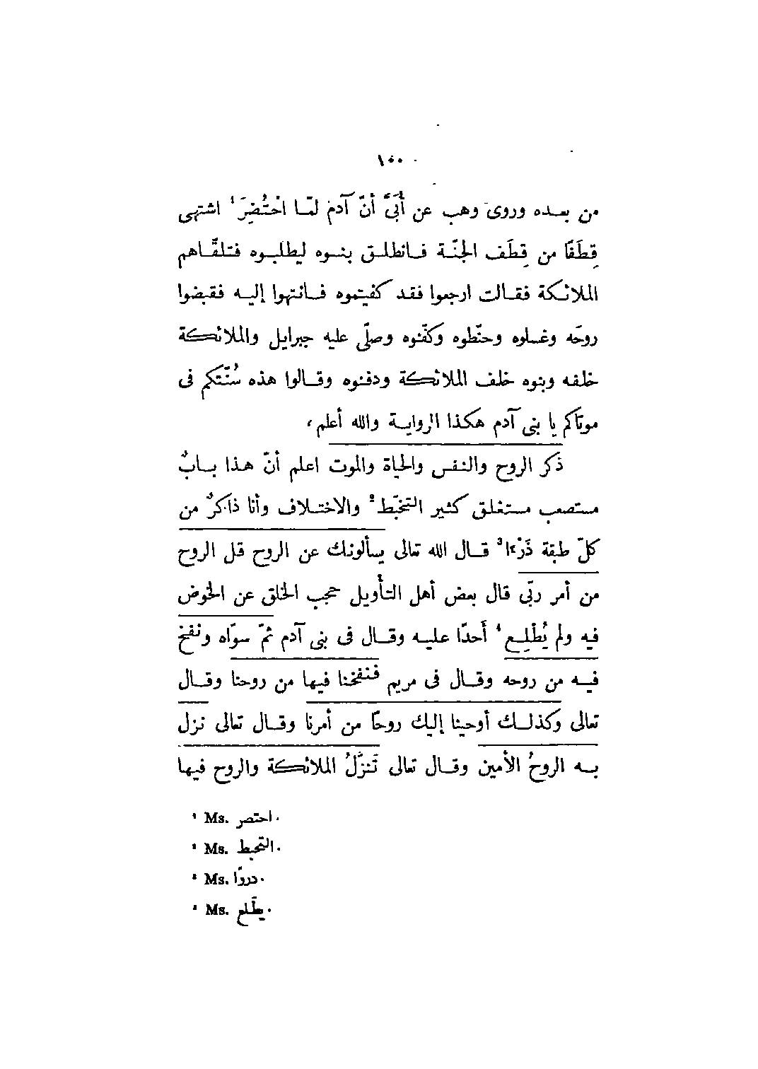 اعلم أنّ هذا باب مستصعب مستغلق كثير التخبط [2] والإختلاف وأنا ذاكر من كل طبقة ذرءاً [3] قال الله تعالى يَسْئَلُونَكَ عَنِ الرُّوحِ قُلِ الرُّوحُ من أَمْرِ رَبِّي 17: 85 قال بعض أهل التأويل حجب الخلق عن الخوض فيه ولم يطلع [4] أحداً عليه وقال في بني آدم ثُمَّ سَوَّاهُ وَنَفَخَ فِيهِ من رُوحِهِ 32: 9 وقال في مريم فَنَفَخْنا فِيها من رُوحِنا 21: 91 وقال تعالى وَكَذلِكَ أَوْحَيْنا إِلَيْكَ رُوحاً من أَمْرِنا 42: 52 وقال تعالى نَزَلَ به الرُّوحُ الْأَمِينُ 26: 193 وقال تعالى تَنَزَّلُ الْمَلائِكَةُ وَالرُّوحُ فِيها 97: 4