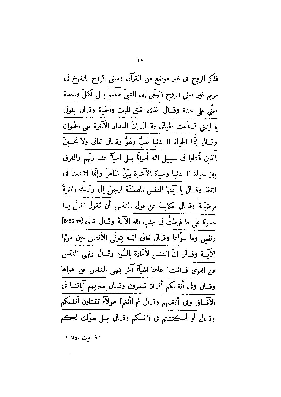 فذكر الروح في غير موضع من القرآن ومعنى الروح المنفوخ في مريم غير معنى الروح الموحّى إلى النبيّ صلى الله عليه وسلم بل لكل واحدة معنى على حدة وقال الَّذِي خَلَقَ الْمَوْتَ وَالْحَياةَ 67: 2 وقال يَقُولُ يا لَيْتَنِي قَدَّمْتُ لِحَياتِي 89: 24 وقال إِنَّ الدَّارَ الْآخِرَةَ لَهِيَ الْحَيَوانُ 29: 64 وقال إِنَّمَا الْحَياةُ الدُّنْيا لَعِبٌ وَلَهْوٌ 47: 36 وقال تعالى وَلا تَحْسَبَنَّ الَّذِينَ قُتِلُوا في سَبِيلِ الله أَمْواتاً بَلْ أَحْياءٌ عِنْدَ رَبِّهِمْ 3: 169 والفرق بين حياة الدنيا وحياة الآخرة بين ظاهر وإنما اجتمعتا في اللفظ وقال يا أَيَّتُهَا النَّفْسُ الْمُطْمَئِنَّةُ ارْجِعِي إِلى رَبِّكِ راضِيَةً مَرْضِيَّةً 89: 27- 28 وقال حكاية عن قول النفس أَنْ تَقُولَ نَفْسٌ يا حَسْرَتى عَلى ما فَرَّطْتُ في جَنْبِ الله 39: 56 الآية وقال تعالى [55] وَنَفْسٍ وَما سَوَّاها 91: 7 وقال تعالى الله يَتَوَفَّى الْأَنْفُسَ حِينَ مَوْتِها 39: 42 الآية وقال إِنَّ النَّفْسَ لَأَمَّارَةٌ بِالسُّوءِ 12: 53 وقال وَنَهَى النَّفْسَ عَنِ الْهَوى 79: 40 فاثبت [1] هاهنا أشياء آخر بنهي النفس عن هواها وقال وَفي أَنْفُسِكُمْ أَفَلا تُبْصِرُونَ 51: 21 وقال سَنُرِيهِمْ آياتِنا في الْآفاقِ وَفي أَنْفُسِهِمْ 41: 53 وقال ثُمَّ [أَنْتُمْ] هؤُلاءِ تَقْتُلُونَ أَنْفُسَكُمْ 2: 85 وقال أَوْ أَكْنَنْتُمْ في أَنْفُسِكُمْ 2: 235 وقال بَلْ سَوَّلَتْ لَكُمْ أَنْفُسُكُمْ أَمْراً 12: 18