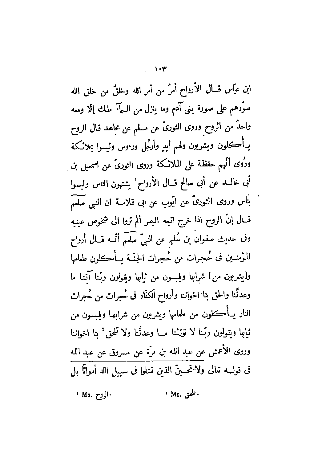 ابن عباس قال الأرواح أمر من أمر الله وخلق من خلق الله صورهم على صورة بني آدم وما ينزل من السماء ملك إلا ومعه واحد من الروح وروى الثوري عن مسلم عن مجاهد قال الروح يأكلون ويشربون ولهم أيد وأرجل ورءوس وليسوا بملائكة وروى أنهم حفظة على الملائكة وروى الثوريّ عن إسماعيل بن أبي خالد عن أبي صالح قال الأرواح [1] يشتهون الناس وليسوا بناس وروى الثوري عن أيوب عن أبي قلامة أن النبي صلى الله عليه وسلم قال إن الروح إذا خرج اتبعه البصر ألم تروا إلى شخوص عينيه وفي حديث صفوان بن سليم عن النبي صلى الله عليه وسلم أنه قال أرواح المؤمنين في حجرات من حجرات الجنّة يأكلون طعامها و [يشربون من] شرابها ويلبسون من ثيابها ويقولون ربنا آتنا ما وعدتنا والحق بنا إخواننا وأرواح الكفار في حجرات من حجرات النار يأكلون من طعامها ويشربون من شرابها ويلبسون من ثيابها ويقولون ربنا لا تؤتنا ما وعدتنا ولا تلحق [2] بنا إخواننا وروى الأعمش عن عبد الله بن مرة عن مسروق عن عبد الله في قوله تعالى وَلا تَحْسَبَنَّ الَّذِينَ قُتِلُوا في سَبِيلِ الله أَمْواتاً بَلْ 3: 169
