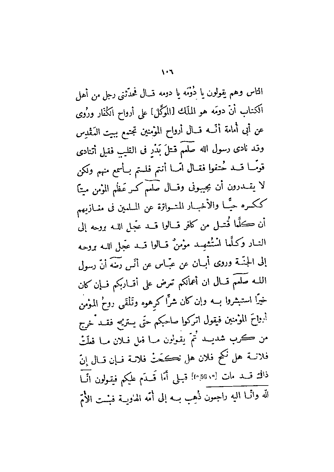 الناس وهم يقولون يا دومه يا دومه قال فحدثني رجل من أهل الكتاب أن دومه هو الملك [الموكل] على أرواح الكفار وروى عن أبي أمامة أنه قال أرواح المؤمنين تجتمع ببيت المقدس وقد نادى رسول الله صلى الله عليه وسلم قتل بدر في القليب فقيل أتنادي قوماً قد حتفوا فقال أما أنتم فلستم بأسمع منهم ولكن لا يقدرون أن يجيبوني وقال صلى الله عليه وسلم كسر عظم المؤمن ميتاً ككسره حيا والأخبار المتواترة عن المسلمين في مغازيهم أن كلما قتل من كافر قالوا قد عجل الله بروحه إلى النار وكلما استشهد مؤمن قالوا قد عجل الله بروحه إلى الجنة وروى أبان عن عباس عن أنس رضي الله عنه أن رسول الله صلى الله عليه وسلم قال أن أعمالكم تعرض على أقاربكم فإن كان خيراً استبشروا به وإن كان شراً كرهوه وتلقى روح المؤمن أرواح المؤمنين فيقول اتركوا صاحبكم حتى يستريح فقد خرج من كرب شديد ثم يقولون ما فعل فلان ما فعلت فلانة هل نكح فلان هل نكحت فلانة فإن قال إن ذاك قد مات [56] قبلي أما قدم عليكم فيقولون إِنَّا لِلَّهِ وَإِنَّا إِلَيْهِ راجِعُونَ 2: 156 ذهب به إلى أمه الهاوية فبئست الأم