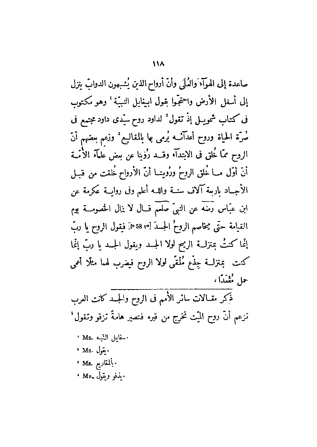 صاعدة إلى الهواء والعلى وأن أرواح الذين يشبهون الدواب ينزل إلى أسفل الأرض واحتجوا بقول ابيغايل النبيه [1] وهو مكتوب في كتاب شمويل إذ تقول [2] لداود روح سيدي داود مجتمع في صرة الحياة وروح أعدائه يرمي بها بالمقاليع [3] وزعم بعضهم أن الروح مما خلق في الابتداء وقد روينا عن بعض علماء الأمة أن أول ما خلق الروح وروينا أن الأرواح خلقت من قبل الأجساد بأربعة آلاف سنة والله أعلم وفي رواية عكرمة عن ابن عباس رضي الله عنه عن النبي صلى الله عليه وسلم قال لا يزال الخصومة يوم القيامة حتى يخاصم الروح الجسد [58] فيقول الروح يا ربّ إنّما كنت بمنزلة الريح لولا الجسد ويقول الجسد يا رب إنما كنت بمنزلة جذع ملقى لولا الروح فيضرب لهما مثلاً أعمى حمل مقعداً،