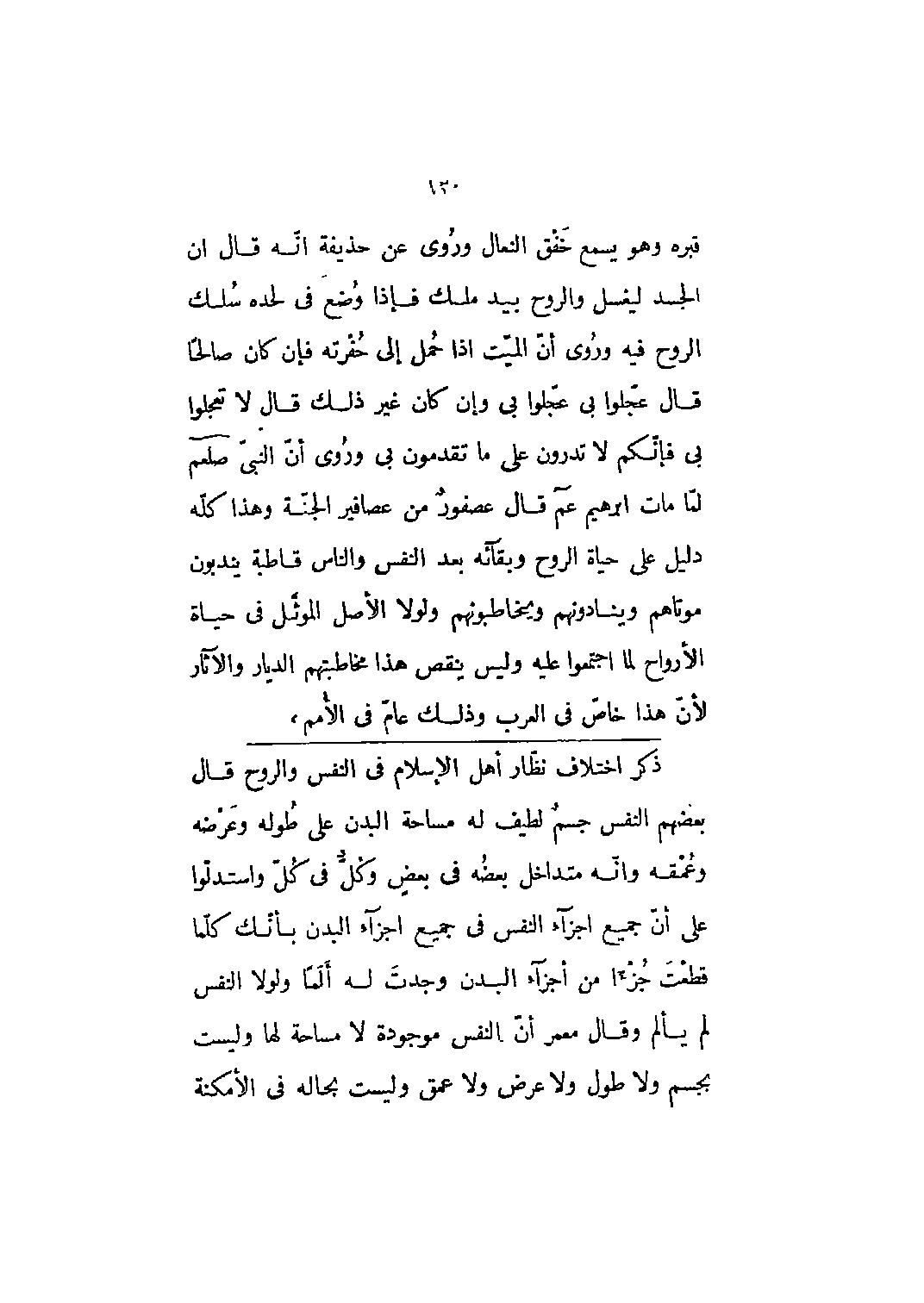قبره وهو يسمع خفق النعال وروى عن حذيفة أنه قال أن الجسد ليغسل والروح بيد ملك فإذا وضع في لحده سلك الروح فيه وروى أن الميت إذا حمل إلى حفرته فإن كان صالحاً قال عجلوا بي عجلوا بي وإن كان غير ذلك قال لا تعجلوا بي فإنكم لا تدرون على ما تقدمون بي وروى أن النبي صلى الله عليه وسلم لما مات إبراهيم عم قال عصفور من عصافير الجنة وهذا كله دليل على حياة الروح وبقائه بعد النفس والناس قاطبة يندبون موتاهم وينادونهم ويخاطبونهم ولولا الأصل الموثل في حياة الأرواح لما اجتمعوا عليه وليس ينقص هذا مخاطبتهم الديار والآثار لأن هذا خاص في العرب وذلك عام في الأمم،