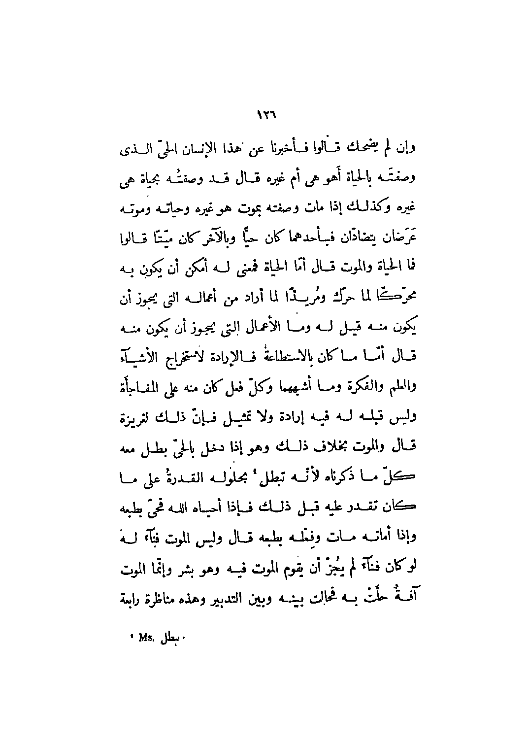 وإن لم يضحك قالوا فأخبرنا عن هذا الإنسان الحي الذي وصفته بالحياة أهو هي أم غيره قال قد وصفته بحياة هي غيره وكذلك إذا مات وصفته بموت هو غيره وحياته وموته عرضان يتضادان فبأحدهما كان حياً وبالآخر كان ميتاً قالوا فما الحياة والموت قال أما الحياة فمعنى له أمكن أن يكون به محركاً لما حرك ومريداً لما أراد من أعماله التي يجوز أن يكون منه قيل له وما الأعمال التي يجوز أن يكون منه قال أما ما كان بالاستطاعة فالإرادة لاستخراج الأشياء والعلم والفكرة وما أشبههما وكل فعل كان منه على المفاجأة وليس قبله له فيه إرادة ولا تمثيل فإن ذلك لغريزة قال والموت بخلاف ذلك وهو إذا دخل بالحي بطل معه كل ما ذكرناه لأنه تبطل [1] بحلوله القدرة على ما كان تقدر عليه قبل ذلك فإذا أحياه الله فحي بطبعه وإذا أماته مات وفعله بطبعه قال وليس الموت فناء له لو كان فناء لم يجز أن يقوم الموت فيه وهو بشر وإنما الموت آفة حلّت به فحالت بينه وبين التدبير وهذه مناظرة رابعة