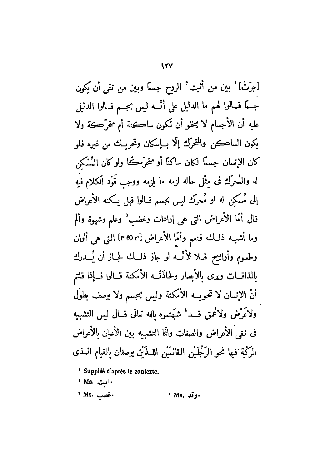 [جرت] [1] بين من أثبت [2] الروح جسماً وبين من نفى أن يكون جسماً قالوا لهم ما الدليل على أنه ليس بجسم قالوا الدليل عليه أن الأجسام لا يخلو أن تكون ساكنة أم متحركة ولا يكون الساكن والمتحرك إلا بإسكان وتحريك من غيره فلو كان الإنسان جسماً لكان ساكناً أو متحركاً ولو كان المسكن له والمحرّك في مثل حاله لزمه ما يلزمه ووجب قود الكلام فيه إلى مسكن له أو محرك ليس بجسم قالوا فهل يسكنه الأعراض قال أما الأعراض التي هي إرادات وغضب [3] وعلم وشهوة وألم وما أشبه ذلك فنعم وأما الأعراض [60] التي هي ألوان وطعوم وأراييح فلا لأنه لو جاز ذلك لجاز أن يدرك بالمذاقات ويرى بالأبصار ولحاذته الأمكنة قالوا فإذا قلتم إن الإنسان لا تحويه الأمكنة وليس بجسم ولا يوصف بطول ولا عرض ولا عمق قد [4] شبهتموه باللَّه تعالى قال ليس التشبيه في نفي الأعراض والصفات وإنما التشبيه بين الأعيان بالأعراض المركبة فيها نحو الرجلين القائمين اللذين يوصفان بالقيام الّذي