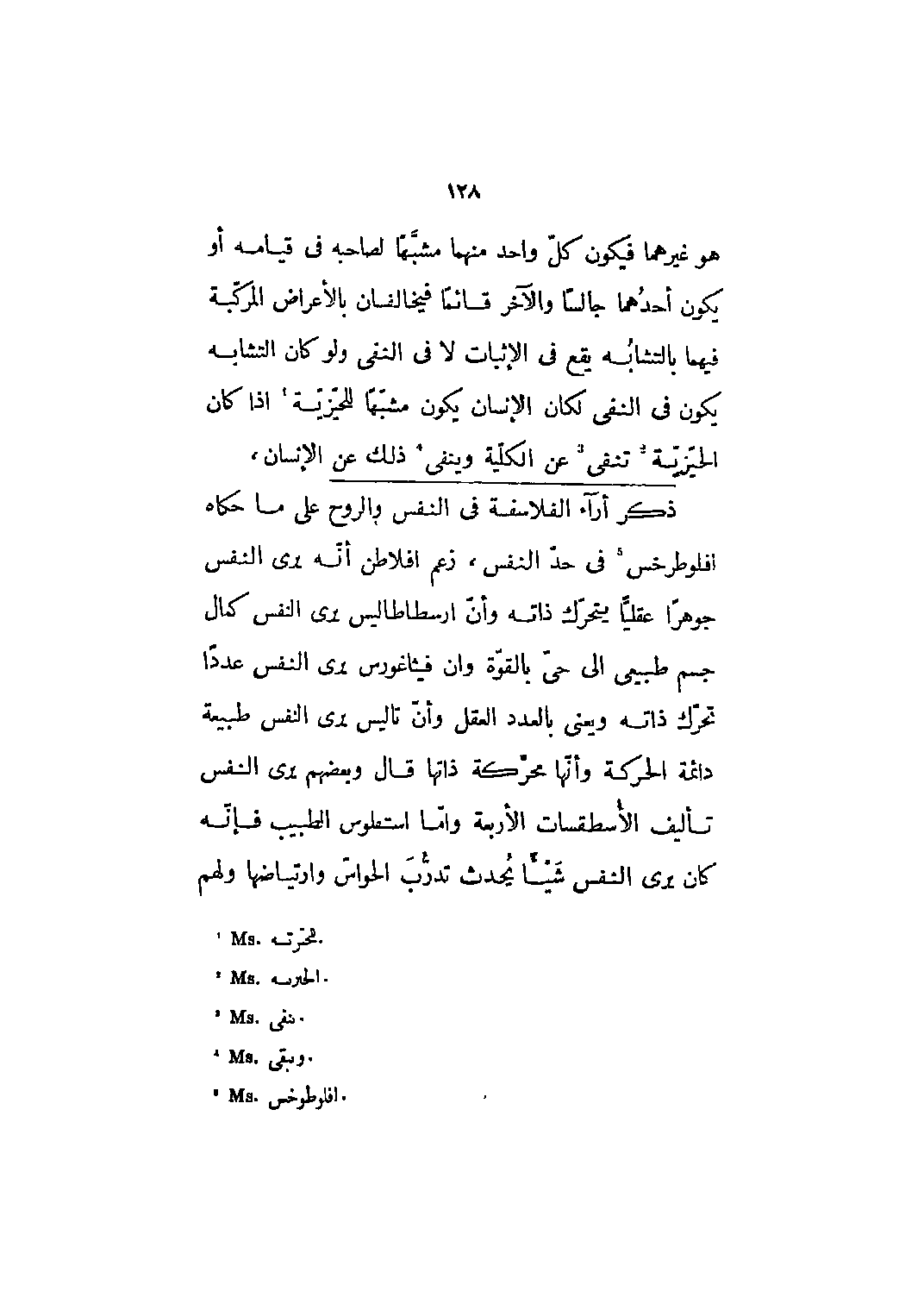 على ما حكاه افلوطرخس [5] في حد النفس، زعم افلاطن أنه يرى النفس جوهراً عقلياً يتحرك ذاته وأن ارسطاطاليس يرى النفس كمال جسم طبيعي إلى حي بالقوة وإن فيثاغورس يرى النفس عدداً تحرك ذاته ويعني بالعدد العقل وأن تاليس يرى النفس طبيعة دائمة الحركة وأنها محركة ذاتها قال وبعضهم يرى النفس تأليف الأسطقسات الأربعة وامّا استعلوس الطبيب فإنه كان يرى النفس شيئاً يحدث تدرّب الحواسّ وارتياضها ولهم