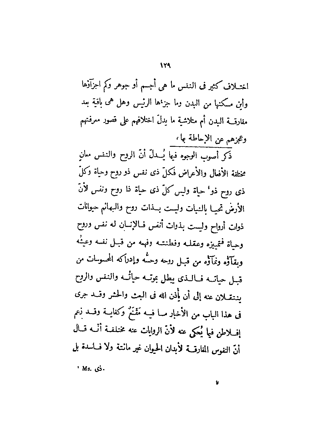 يدل أن الروح والنفس معان مختلفة الأفعال والأعراض فكل ذي نفس ذو روح وحياة وكل ذي روح ذو [1] حياة وليس كلّ ذي حياة ذا روح ونفس لأن الأرض تحيا بالنبات وليست بذات روح والبهائم حيوانات ذوات أرواح وليست بذوات أنفس فالإنسان له نفس وروح وحياة فتمييزه وعقله وفطنته وفهمه من قبل نفسه وعيشه وبقاؤه ونماؤه من قبل روحه وحسه وإدراكه المحسوسات من قبل حياته فالذي يبطل بموته حياته والنفس والروح ينتقلان عنه إلى أن يأذن الله في البعث والحشر وقد جرى في هذا الباب من الأخبار ما فيه مقنع وكفاية وقد زعم إفلاطن فيما يحكى عنه لأن الروايات عنه مختلفة أنه قال أن النفوس المفارقة لأبدان الحيوان غير مائتة ولا فاسدة بل