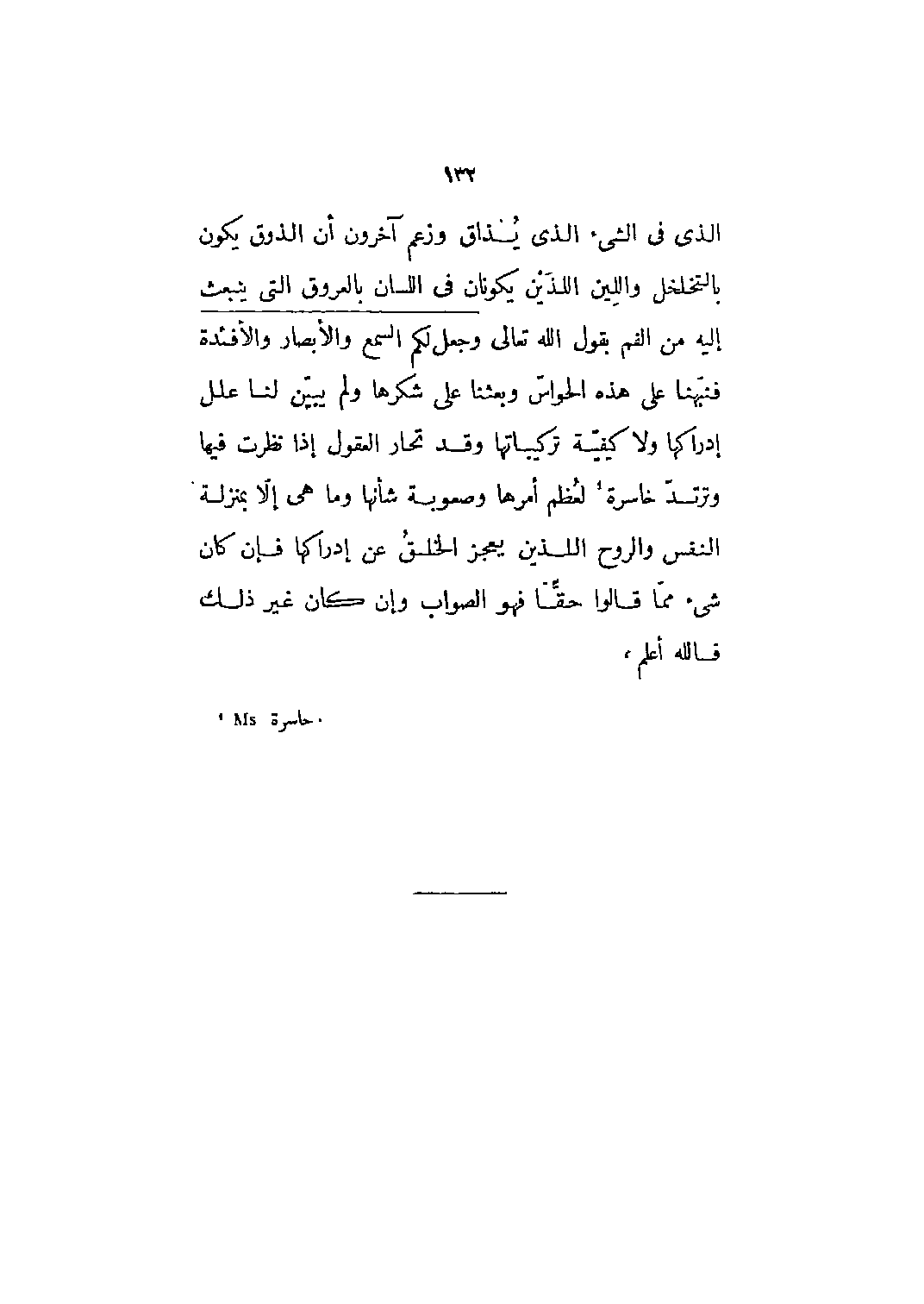 الذي في الشيء الذي يذاق وزعم آخرون أن الذوق يكون بالتخلخل واللين اللذين يكونان في اللسان بالعروق التي ينبعث إليه من الفم بقول الله تعالى وَجَعَلَ لَكُمُ السَّمْعَ وَالْأَبْصارَ وَالْأَفْئِدَةَ 16: 78 فنبهنا على هذه الحواس وبعثنا على شكرها ولم يبين لنا علل إدراكها ولا كيفية تركيباتها وقد تحار العقول إذا نظرت فيها وترتد خاسرة [1] لعظم أمرها وصعوبة شأنها وما هي إلا بمنزلة النفس والروح اللذين يعجز الخلق عن إدراكها فإن كان شيء مما قالوا حقاً فهو الصواب وإن كان غير ذلك فاللَّه أعلم،