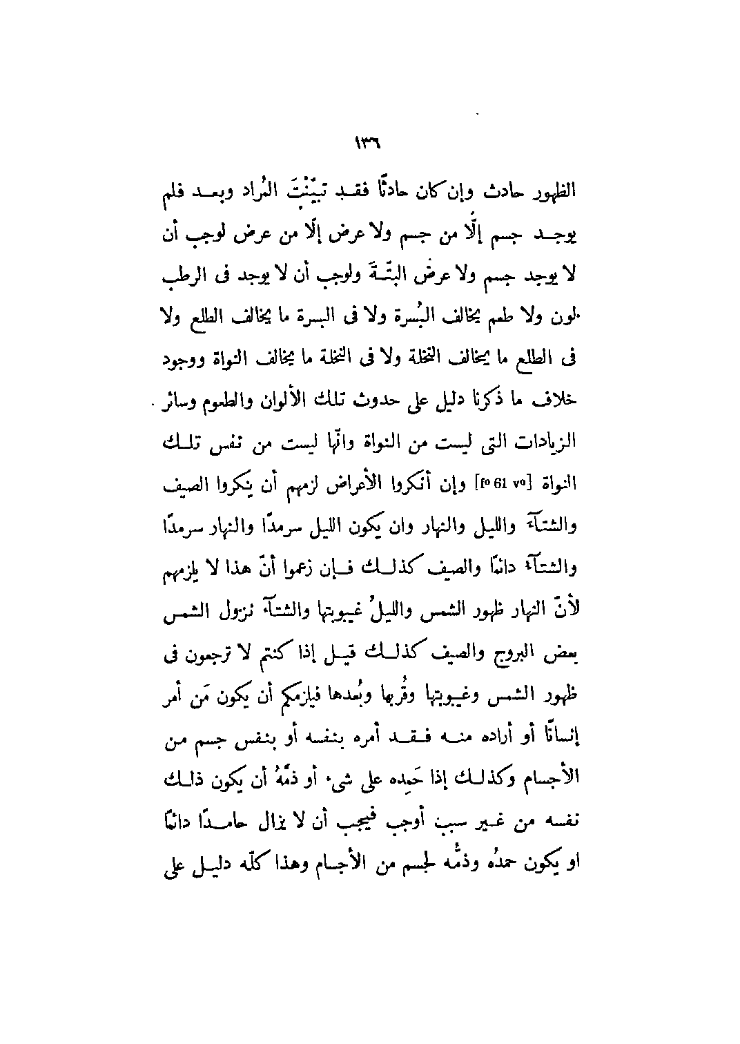 الظهور حادث وإن كان حادثاً فقد تبينت المراد وبعد فلم يوجد جسم إلا من جسم ولا عرض إلا من عرض لوجب أن لا يوجد جسم ولا عرض البتة ولوجب أن لا يوجد في الرطب لون ولا طعم يخالف البسرة ولا في البسرة ما يخالف الطلع ولا في الطلع ما يخالف النخلة ولا في النخلة ما يخالف النواة ووجود خلاف ما ذكرنا دليل على حدوث تلك الألوان والطعوم وسائر الزيادات التي ليست من النواة وأنها ليست من نفس تلك النواة [61] وإن أنكروا الأعراض لزمهم أن ينكروا الصيف والشتاء والليل والنهار وأن يكون الليل سرمداً والنهار سرمداً والشتاء دائماً والصيف كذلك فإن زعموا أن هذا لا يلزمهم لأن النهار ظهور الشمس والليل غيبوبتها والشتاء نزول الشمس بعض البروج والصيف كذلك قيل إذا كنتم لا ترجعون في ظهور الشمس وغيبوبتها وقربها وبعدها فيلزمكم أن يكون من أمر إنساناً أو أراده منه فقد أمره بنفسه أو بنفس جسم من الأجسام وكذلك إذا حمده على شيء أو ذمه أن يكون ذلك نفسه من غير سبب أوجب فيجب أن لا يزال حامدا دائما أو يكون حمده وذمه لجسم من الأجسام وهذا كله دليل على