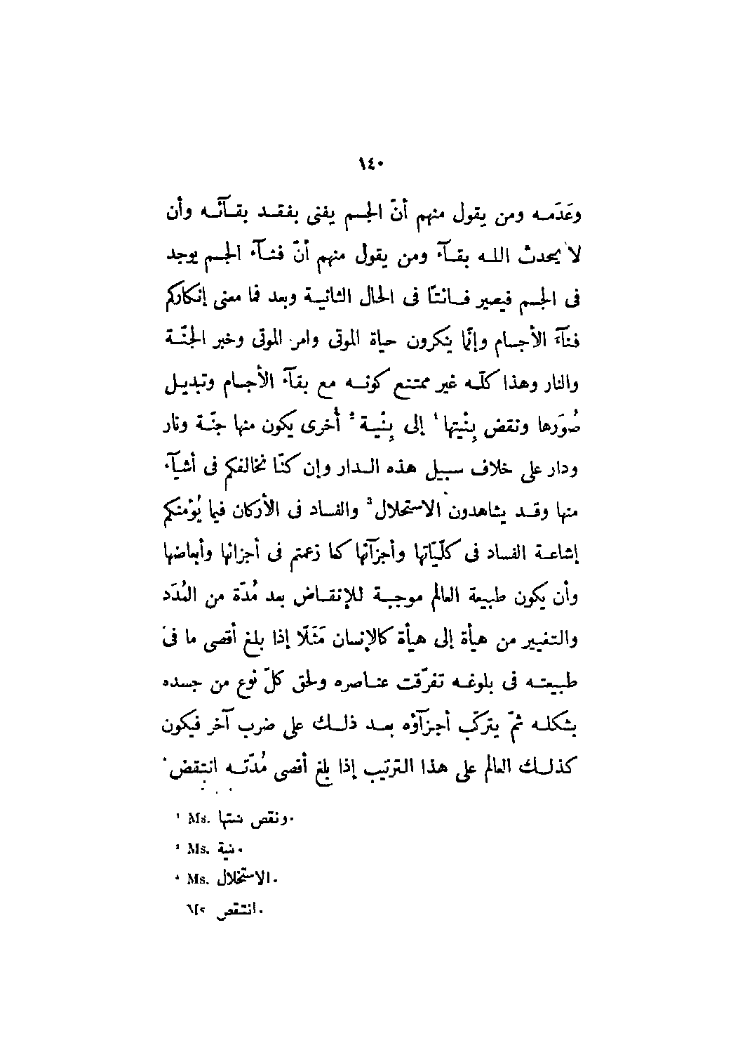 وعدمه ومن يقول منهم أن الجسم يفنى بفقد بقائه وأن لا يحدث الله بقاء ومن يقول منهم أن فناء الجسم يوجد في الجسم فيصير فائتاً في الحال الثانية وبعد فما معنى إنكاركم فناء الأجسام وإنما ينكرون حياة الموتى وامر الموتى وخبر الجنة والنار وهذا كله غير ممتنع كونه مع بقاء الأجسام وتبديل صورها ونقض بنيتها [1] إلى بنية [2] أخرى يكون منها جنة ونار ودار على خلاف سبيل هذه الدار وإن كنا نخالفكم في أشياء منها وقد يشاهدون الاستحلال [3] والفساد في الأركان فيما يؤمنكم إشاعة الفساد في كلياتها وأجزائها كما زعمتم في أجزائها وأبعاضها وأن يكون طبيعة العالم موجبة للإنقاض بعد مدة من المدد والتغيير من هيئة إلى هيئة كالإنسان مثلاً إذا بلغ أقصى ما في طبيعته في بلوغه تفرقت عناصره ولحق كل نوع من جسده بشكله ثم يتركب أجزاؤه بعد ذلك على ضرب آخر فيكون كذلك العالم على هذا الترتيب إذا بلغ أقصى مدّته انتقض [4]