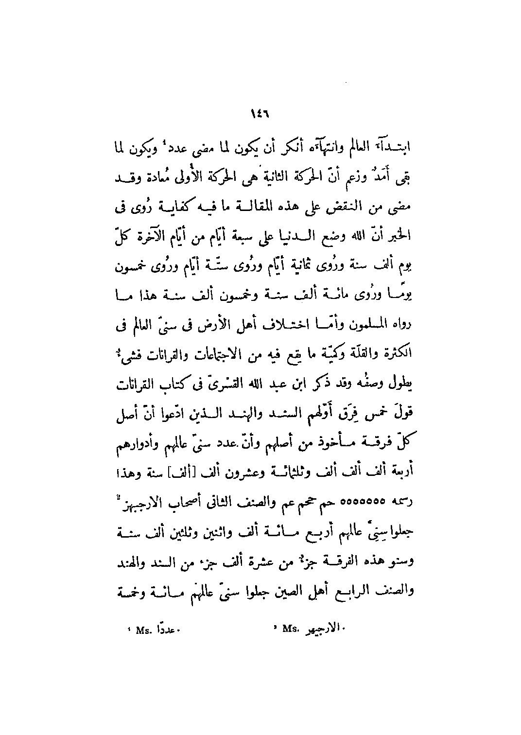 ابتداء العالم وانتهاءه أنكر أن يكون لما مضى عدد [1] ويكون لما بقي أمد وزعم أن الحركة الثانية هي الحركة الأولى معادة وقد مضى من النقض على هذه المقالة ما فيه كفاية روى في الخبر أن الله وضع الدنيا على سبعة أيام من أيام الآخرة كل يوم ألف سنة وروى ثمانية أيام وروى ستة أيام وروى خمسون يوماً وروى مائة ألف سنة وخمسون ألف سنة هذا ما رواه المسلمون وأما اختلاف أهل الأرض في سني العالم في الكثرة والقلة وكمية ما يقع فيه من الاجتماعات والقرانات فشيء يطول وصفه وقد ذكر ابن عبد الله القسري في كتاب القرانات قول خمس فرق أوّلهم السند والهند الذين ادّعوا أنّ أصل كلّ فرقة مأخوذ من أصلهم وأن عدد سني عالمهم وأدوارهم أربعة ألف ألف ألف وثلاثمائة وعشرون ألف ألف سنة وهذا رسمه 5555555 حم ححم عم والصنف الثاني أصحاب الارجبهز [2] جعلوا سني عالمهم أربع مائة ألف واثنين وثلاثين ألف سنة وسنو هذه الفرقة جزء من عشرة ألف جزء من السند والهند والصنف الرابع أهل الصين جعلوا سنىّ عالمهم مائة وخمسة