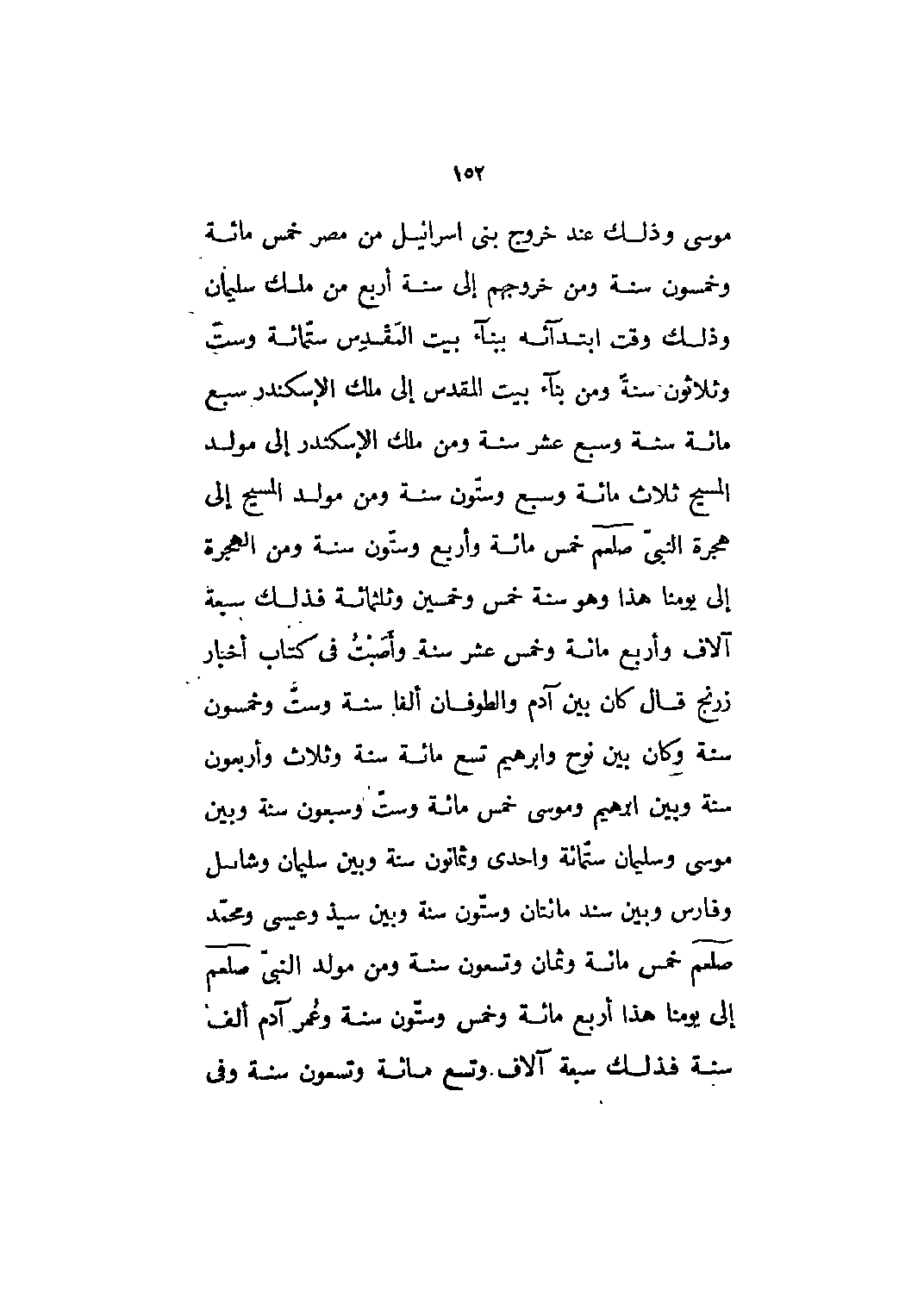 موسى وذلك عند خروج بني إسرائيل من مصر خمس مائة وخمسون سنة ومن خروجهم إلى سنة أربع من ملك سليمان وذلك وقت ابتدائه ببناء بيت المقدس ستمائة وست وثلاثون سنة ومن بناء بيت المقدس إلى ملك الإسكندر سبع مائة سنة وسبع عشر سنة ومن ملك الإسكندر إلى مولد المسيح ثلاث مائة وسبع وستون سنة ومن مولد المسيح إلى هجرة النبي صلى الله عليه وسلم خمس مائة وأربع وستون سنة ومن الهجرة إلى يومنا هذا وهو سنة خمس وخمسين وثلاثمائة فذلك سبعة آلاف وأربع مائة وخمس عشر سنة وأصبت في كتاب أخبار زرنج قال كان بين آدم والطوفان ألفا سنة وست وخمسون سنة وكان بين نوح وإبراهيم تسع مائة سنة وثلاث وأربعون سنة وبين إبراهيم وموسى خمس مائة وست وسبعون سنة وبين موسى وسليمان ستّمائة واحدى وثمانون سنة وبين سليمان وشامل وفارس وبين سند مائتان وستون سنة وبين سيذ وعيسى ومحمد صلى الله عليه وسلم خمس مائة وثمان وتسعون سنة ومن مولد النبي صلى الله عليه وسلم إلى يومنا هذا أربع مائة وخمس وستون سنة وعمر آدم ألف سنة فذلك سبعة آلاف وتسع مائة وتسعون سنة وفي