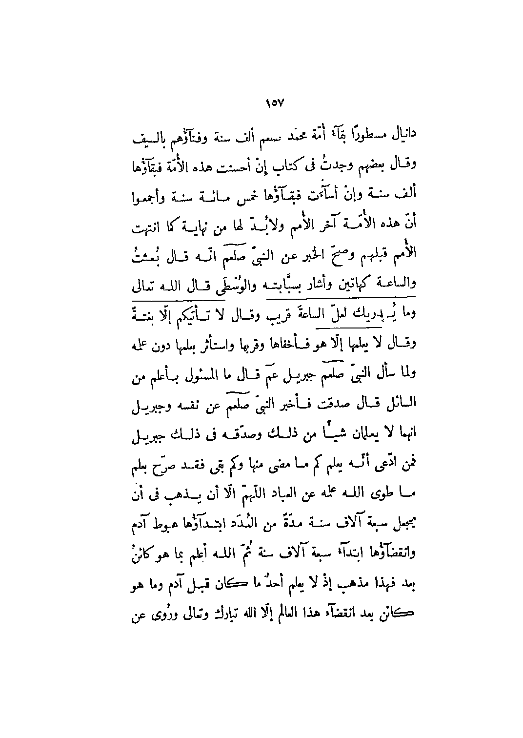 دانيال مسطوراً بقاء أمة محمد صلى الله عليه وسلم ألف سنة وفناؤهم بالسيف وقال بعضهم وجدت في كتاب إن أحسنت هذه الأمّة فبقاؤها ألف سنة وإن أساءت فبقاؤها خمس مائة سنة وأجمعوا أن هذه الأمة آخر الأمم ولا بد لها من نهاية كما انتهت الأمم قبلهم وصح الخبر عن النبي صلى الله عليه وسلم أنه قال بعثت والساعة كهاتين وأشار بسبابته والوسطى قال الله تعالى وَما يُدْرِيكَ لَعَلَّ السَّاعَةَ قَرِيبٌ 42: 17 وقال لا تَأْتِيكُمْ إِلَّا بَغْتَةً 7: 187 وقال لا يَعْلَمُها إِلَّا هُوَ 6: 59 فأخفاها وقربها واستأثر بعلمها دون علمه ولما سأل النبي صلى الله عليه وسلم جبريل عم قال ما المسئول بأعلم من السائل قال صدقت فأخبر النبي صلى الله عليه وسلم عن نفسه وجبريل أنهما لا يعلمان شيئاً من ذلك وصدقه في ذلك جبريل فمن ادعى أنه يعلم كم ما مضى منها وكم بقى فقد صرح بعلم ما طوى الله علمه عن العباد اللَّهمّ إلا أن يذهب في أن يجعل سبعة آلاف سنة مدة من المدد ابتداؤها هبوط آدم وانقضاؤها ابتداء سبعة آلاف سنة ثم الله أعلم بما هو كائن بعد فهذا مذهب إذ لا يعلم أحد ما كان قبل آدم وما هو كائن بعد انقضاء هذا العالم إلا الله تبارك وتعالى وروي عن