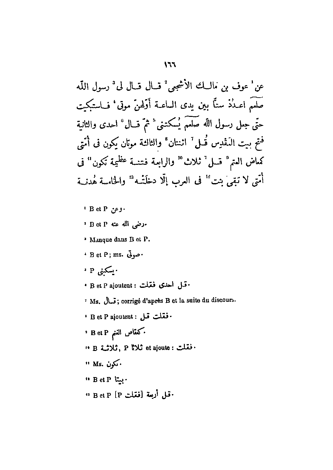 عن [1] عوف بن مالك الأشجعي [2] قال قال لي [3] رسول الله صلى الله عليه وسلم اعدد ستاً بين يدي الساعة أولهن موتي [4] فاستبكيت حتى جعل رسول الله صلى الله عليه وسلم يسكتني [5] ثم قال [6] إحدى والثانية فتح بيت المقدس قل [7] اثنتان [8] والثالثة موتان يكون في أمتي كمعاض العتم [9] قل [7] ثلاث [10] والرابعة فتنة عظيمة تكون [11] في أمّتى لا تبقى بنت [12] في العرب إلا دخلته [13] والخامسة هدنة