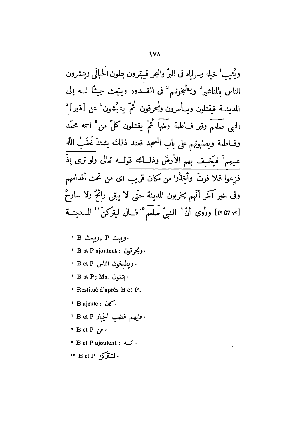 ويثيب [1] خيله وسراياه في البر والبحر فيبقرون بطون الحبالى وينشرون الناس بالمناشير [2] ويطبخونهم [3] في القدور ويبعث جيشاً له إلى المدينة فيقتلون ويأسرون ويحرقون ثم ينبشون [4] عن [قبر] [5] النبي صلى الله عليه وسلم وقبر فاطمة رضي الله عنها ثم يقتلون كل من [6] اسمه محمد وفاطمة ويصلبونهم على باب المسجد فعند ذلك يشتد غضب الله عليهم [7] فيخسف بهم الأرض وذلك قوله تعالى وَلَوْ تَرى إِذْ فَزِعُوا فَلا فَوْتَ وَأُخِذُوا من مَكانٍ قَرِيبٍ 34: 51 أي من تحت أقدامهم وفي خبر آخر إنهم يخربون المدينة حتّى لا يبقى رائح ولا سارح [67] وروى أن [8] النبي صلى الله عليه وسلم [9] قال ليتركنّ [10] المدينة