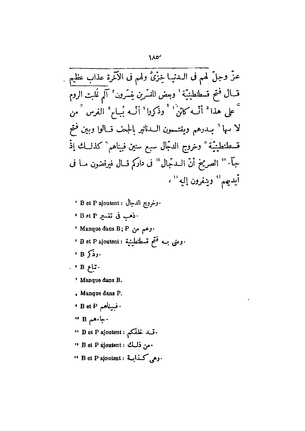 عز وجل لَهُمْ في الدُّنْيا خِزْيٌ وَلَهُمْ في الْآخِرَةِ عَذابٌ عَظِيمٌ 2: 114 قال فتح قسطنطينية [1] وبعض المفسرين يفسرون [2] آلم غُلِبَتِ الرُّومُ 30: 1- 2 على هذا [3] أنه كائن [4] وذكروا [5] أنه يباع [6] الفرس من لا [؟] ها [7] بدرهم ويقتسمون الدنانير بالجحف قالوا وبين فتح قسطنطينية [8] وخروج الدجال سبع سنين فبينا هم [9] كذلك إذ جاء [10] الصريخ أن الدجال [11] في داركم قال فيرفضون ما في أيديهم [12] وينفرون إليه [13] ،