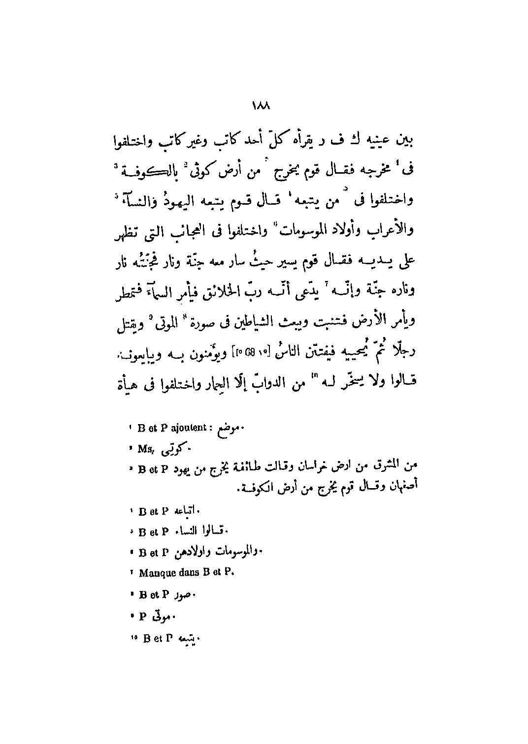 بين عينيه ك ف ر يقرأه كل أحد كاتب وغير كاتب واختلفوا في [1] مخرجه فقال قوم يخرج من أرض كوثي [2] بالكوفة [3] واختلفوا في من يتبعه [4] قال قوم يتبعه اليهود والنساء [5] والأعراب وأولاد الموسومات [6] واختلفوا في العجائب التي تظهر على يديه فقال قوم يسير حيث سار معه جنة ونار فجنته نار وناره جنة وإنه [7] يدعى أنه رب الخلائق فيأمر السماء فتمطر ويأمر الأرض فتنبت ويبعث الشياطين في صورة [8] الموتى [9] ويقتل رجلاً ثم يحييه فيفتتن الناس [68] ويؤمنون به ويبايعونه قالوا ولا يسخر له [10] من الدواب إلا الحمار واختلفوا في هيئة