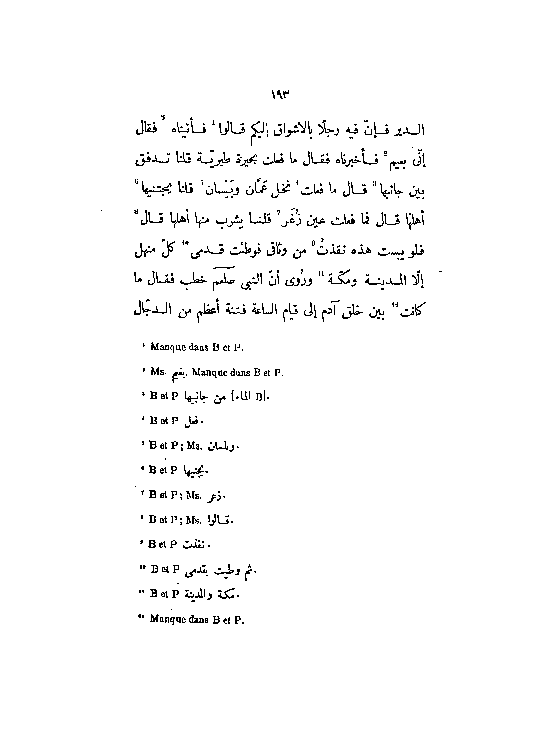 الدير فإن فيه رجلاً بالأشواق إليكم قالوا [1] فأتيناه فقال إني بعيم [2] فأخبرناه فقال ما فعلت بحيرة طبريّة قلنا تدفق بين جانبها [3] قال ما فعلت [4] نخل عمان وبيسان [5] قلنا يجتنيها [6] أهلها قال فما فعلت عين زغر [7] قلنا يشرب منها أهلها قال [8] فلو يبست هذه نقذت [9] من وثاقي فوطئت قدمي [10] كل منهل إلا المدينة ومكة [11] وروى أن النبي صلى الله عليه وسلم خطب فقال ما كانت [12] بين خلق آدم إلى قيام الساعة فتنة أعظم من الدجّال