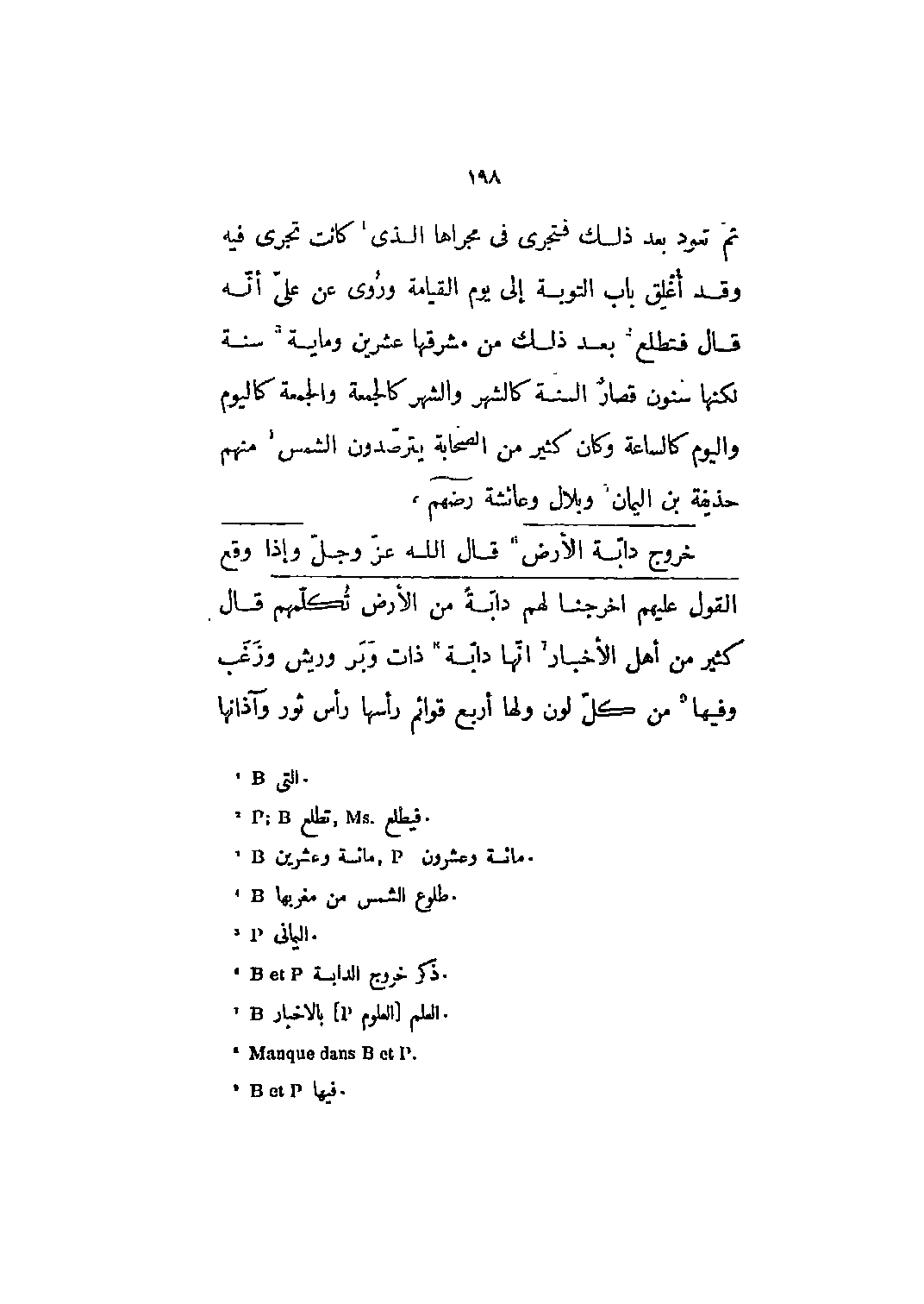 ثم تعود بعد ذلك فتجري في مجراها الذي [1] كانت تجري فيه وقد أغلق باب التوبة إلى يوم القيامة وروى عن على أنه قال فتطلع [2] بعد ذلك من مشرقها عشرين ومائة [3] سنة لكنها سنون قصار السنة كالشهر والشهر كالجمعة والجمعة كاليوم واليوم كالساعة وكان كثير من الصحابة يترصدون الشمس [4] منهم حذيفة بن اليمان [5] وبلال وعائشة رضي الله عنهم،