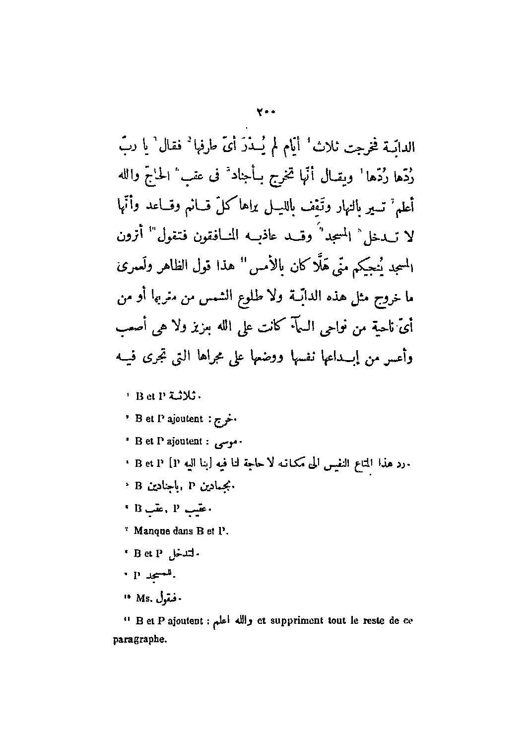 الدابة فخرجت ثلاث [1] أيام لم يدر أي طرفها [2] فقال [3] يا ربّ ردها ردها [4] ويقال أنها تخرج بأجناد [5] في عقب [6] الحاج والله أعلم [7] تسير بالنهار وتقف بالليل يراها كل قائم وقاعد وأنها لا تدخل [8] المسجد [9] وقد عاذ به المنافقون فتقول [10] أترون المسجد ينجيكم مني هلا كان بالأمس [11] هذا قول الظاهر ولعمري ما خروج مثل هذه الدابة ولا طلوع الشمس من مغربها أو من أي ناحية من نواحي السماء كانت على الله بعزيز ولا هي أصعب وأعسر من إبداعها نفسها ووضعها على مجراها التي تجرى فيه