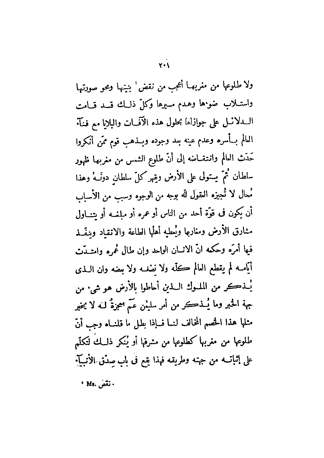 ولا طلوعها من مغربها أعجب من نقض [1] بنيتها ومحو صورتها واستلاب ضوءها وهدم مسيرها وكلّ ذلك قد قامت الدلائل على جواز [هـ] بحلول هذه الآفات والبلايا مع فناء العالم بأسره وعدم عينه بعد وجوده ويذهب قوم ممن أنكروا حدث العالم وانتقاضه إلى أن طلوع الشمس من مغربها ظهور سلطان ثم يستولي على الأرض ويقهر كل سلطان دونه وهذا محال لا تجيزه العقول للَّه بوجه من الوجوه وسبب من الأسباب أن يكون في قوة أحد من الناس أو عمره أو مبلغه أو يتناول مشارق الأرض ومغاربها ويعطيه أهلها الطاعة والانقياد وينفذ فيها أمره وحكمه أن الإنسان الواحد وإن طال عمره وامتدت أيامه لم يقطع العالم كله ولا نصفه ولا بعضه وأن الذي يذكر من الملوك الذين أحاطوا بالأرض هو شيء من جهة الخبر وما يذكر من أمر سليمان عم معجزة له لا يخبر مثلها هذا الخصم المخالف لنا فإذا بطل ما قلناه وجب أن طلوعها من مغربها كطلوعها من مشرقها أو ينكر ذلك لتكلم على إثباته من جهته وطريقه فهذا يقع في باب صدق الأنبياء